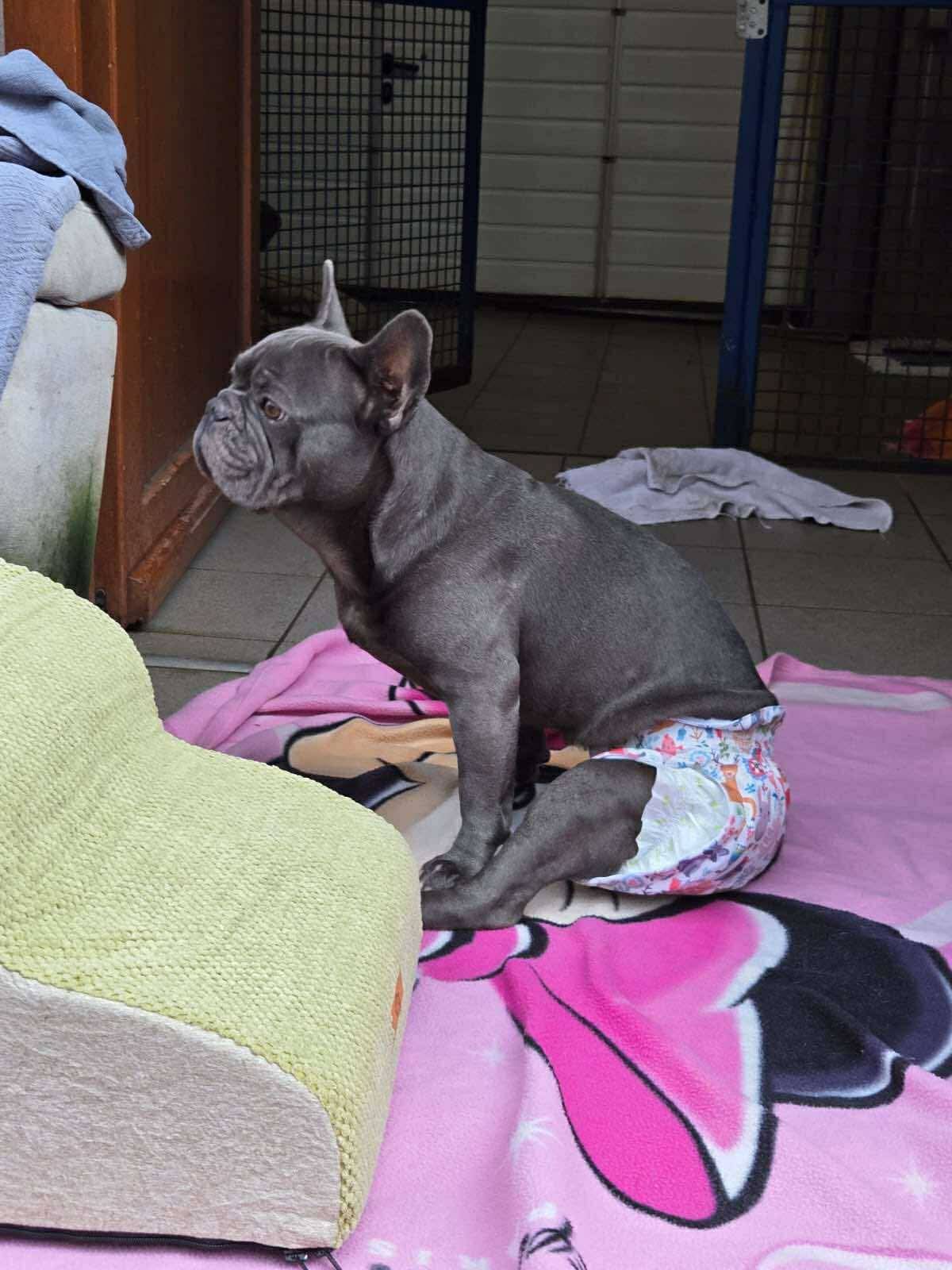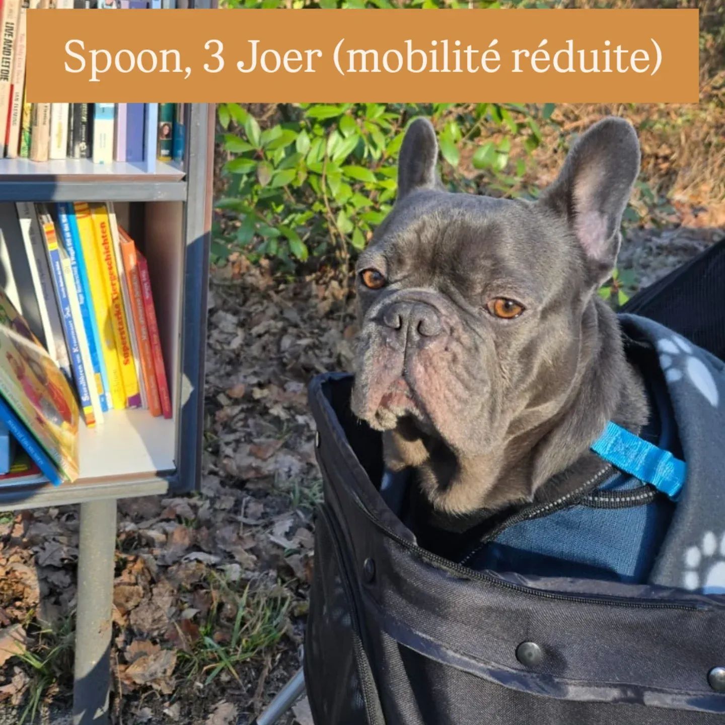De Spoon ass eng 3 Joer al franséisch Bulldog, déi leider bis elo keen einfacht Liewen hat. No engem schlëmme Bandscheibevirfall war de Spoon un den hënneschte Been gelähmt. Trotz enger Operatioun ass d‘Lähmung awer leider (nach) net vill besser ginn. De Spoon ass leider bedéngt duerch seng Lähmung net propper a brauch Wëndelen.