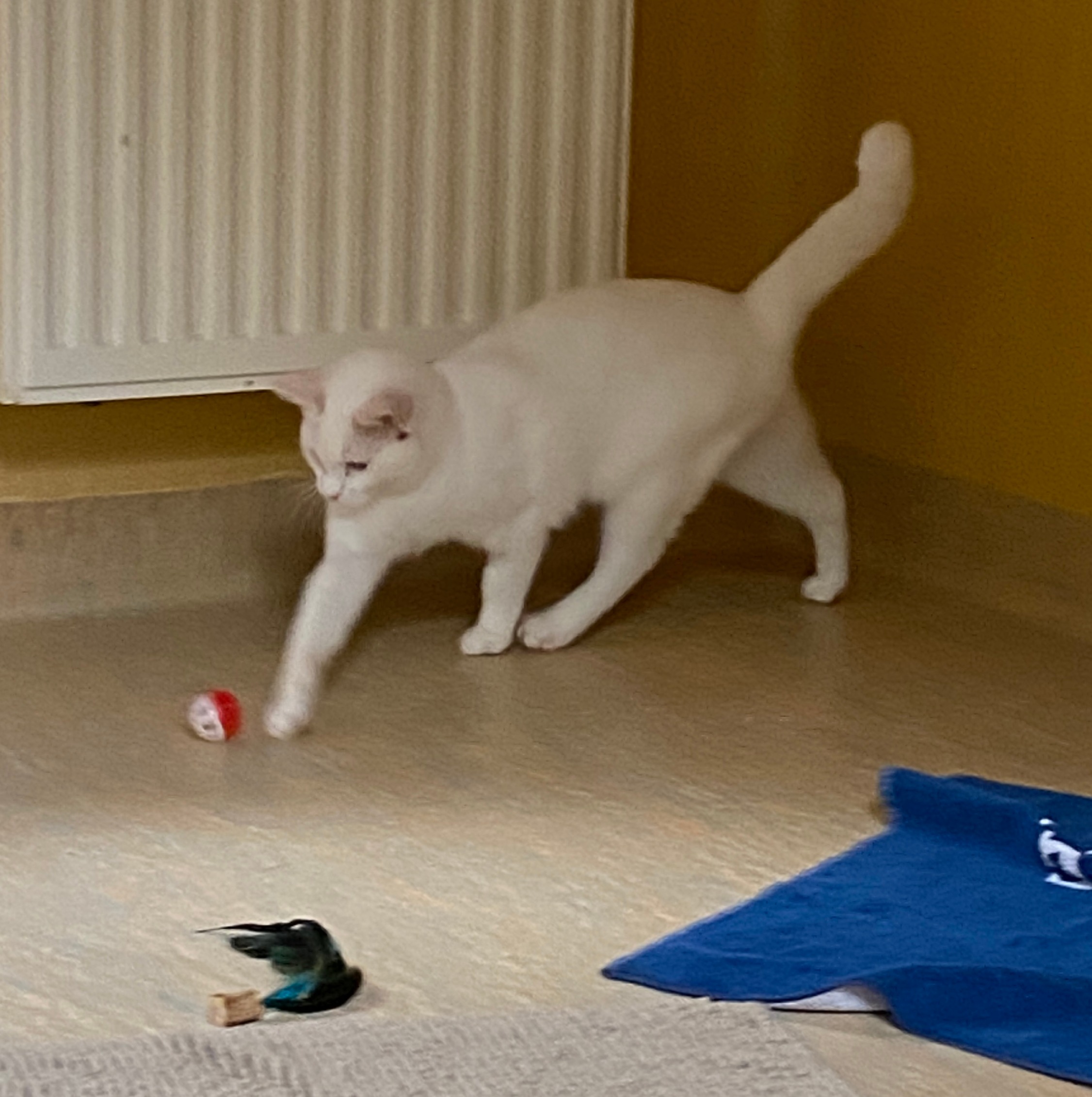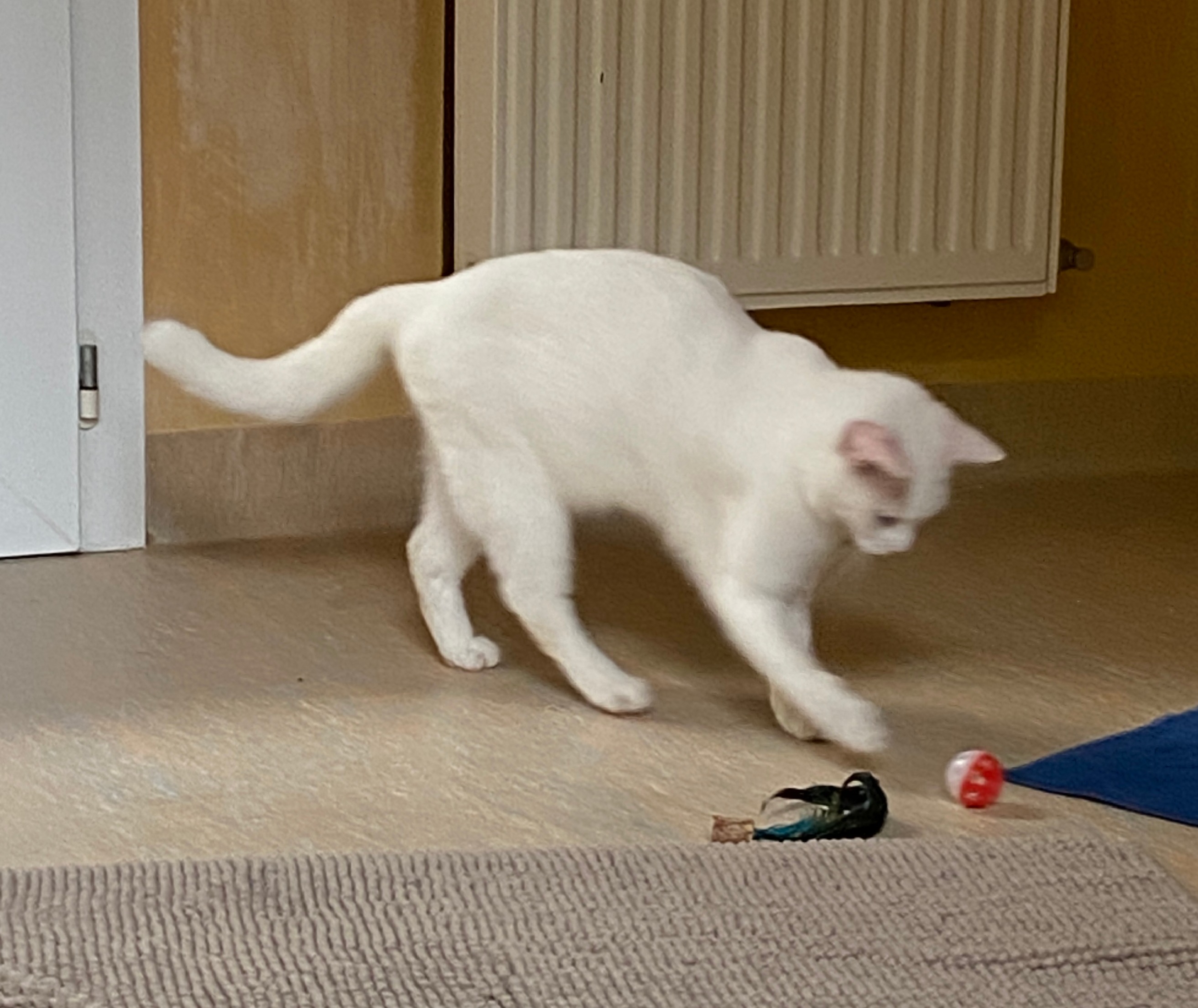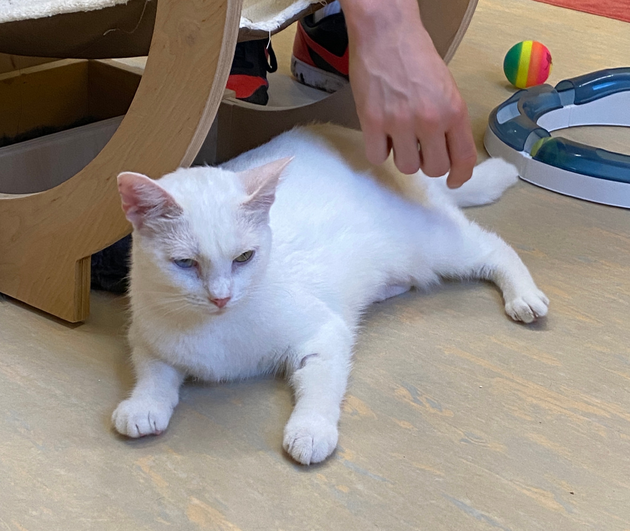 "Wegen meiner zweifarbigen Augen bin ich ein echter Hingucker - wie mein berühmter Namensvetter. Zusammen mit meinem weißen Fell deutet das aber leider auch auf einen Gendefekt hin – ich bin taub. An Lebensqualität mangelt es mir dadurch nicht. Es bedeutet aber, dass ich dauerhaft in der Wohnung leben muss (ein gesicherter Balkon dazu wäre ein Traum), da ich draußen Gefahren nicht rechtzeitig wahrnehmen kann. Leider hat es in meinem bisherigen Zuhause mit der bereits vorhandenen Katze nicht harmoniert. Deshalb suche ich nun ein ruhiges, liebevolles Zuhause, in dem bereits ein sozialer, gut verträglicher Artgenosse lebt. Oder ich könnte einen Kumpel von hier mitbringen. Da ich in meiner Wahrnehmung eingeschränkt bin, ist der Kontakt zu einer anderen Katze besonders wichtig, um mich nicht isoliert zu fühlen. Ich brauche jemanden, an dem ich mich orientieren und mit dem ich kommunizieren kann. Meine Menschen können über alternative Wege mit mir kommunizieren, etwa durch Gestik, Mimik, Vibration oder dergleichen. Sich mir von hinten nähern und anfassen geht gar nicht, das erschrickt und ängstigt mich. Etwas Katzenerfahrung wäre also durchaus hilfreich. Auch mein Magen/Darm sind etwas sensibel. Mit speziellem Gastro-Futter habe ich das aber im Griff."