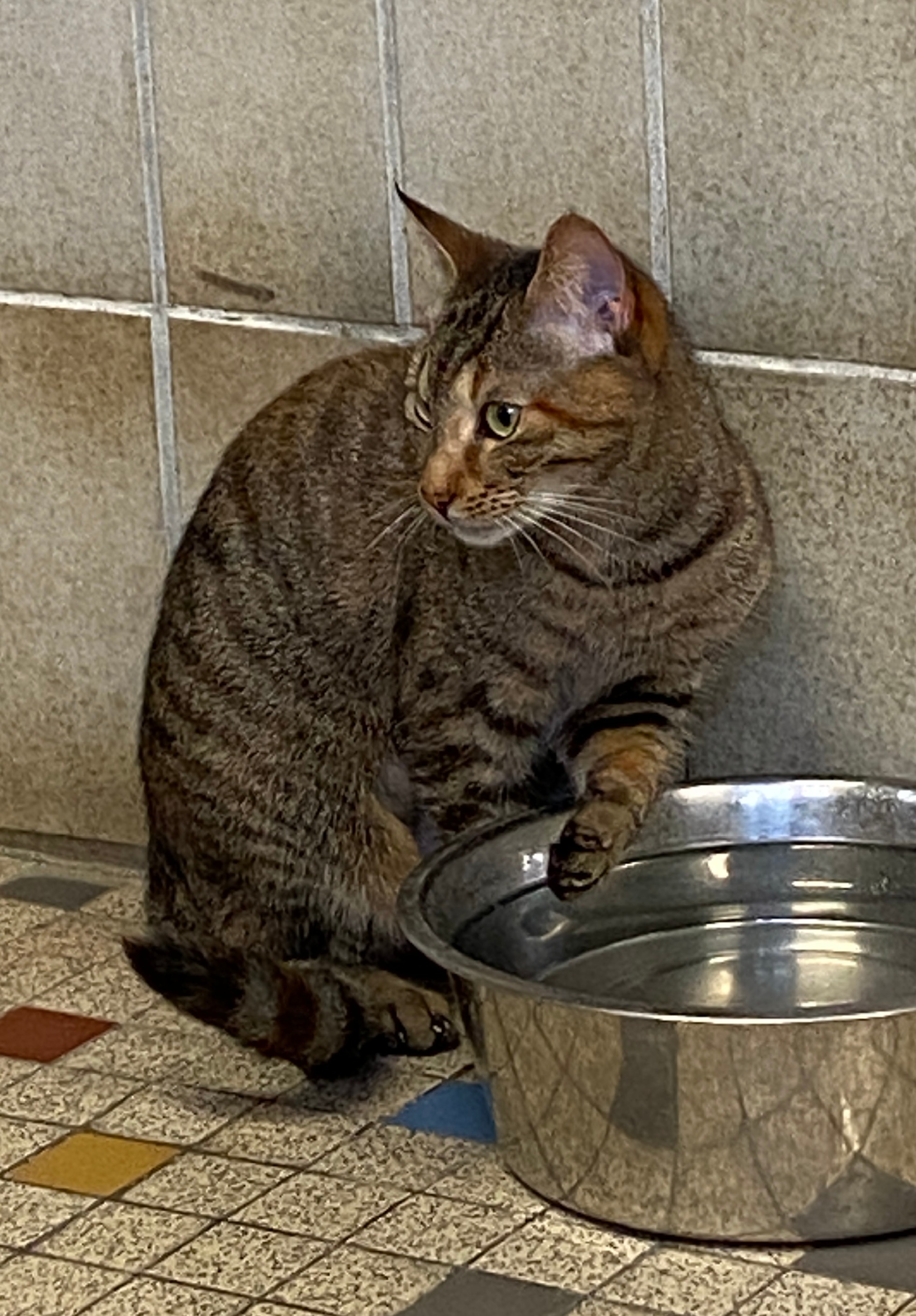 "Wir waren mehrere, die sich zum täglichen Mittagessen - ohne Verpflichtungen - bei einer älteren Dame einfanden. Allerlei Leckeres wurde dort aufgetischt, daher standen wir immer pünktlich auf der Matte. Zu unserem grössten Bedauern zog die nette Lady ins Altersheim, sodass unsere Futterquelle von jetzt auf gleich versiegt war. Deswegen war es nicht schwer, uns alle einzusammeln und ins Asile zu bringen. Das Wichtigste : auch hier stimmt die Verpflegung. Unsere Freundin Blake ist schon auf einem Bauernhof untergekommen - ein Traum auch für Brooke und mich. Größtmögliche Freiheit mit gesichertem Futterplatz, das wär's ! Angefasst werden möchte ich weiterhin nicht."