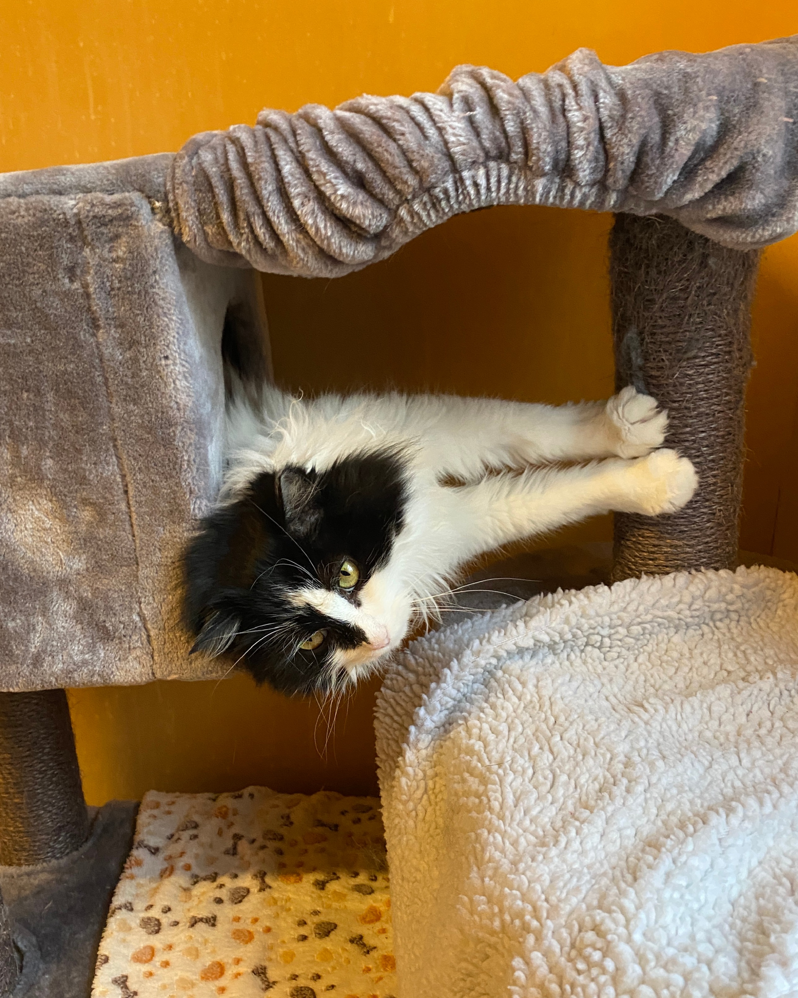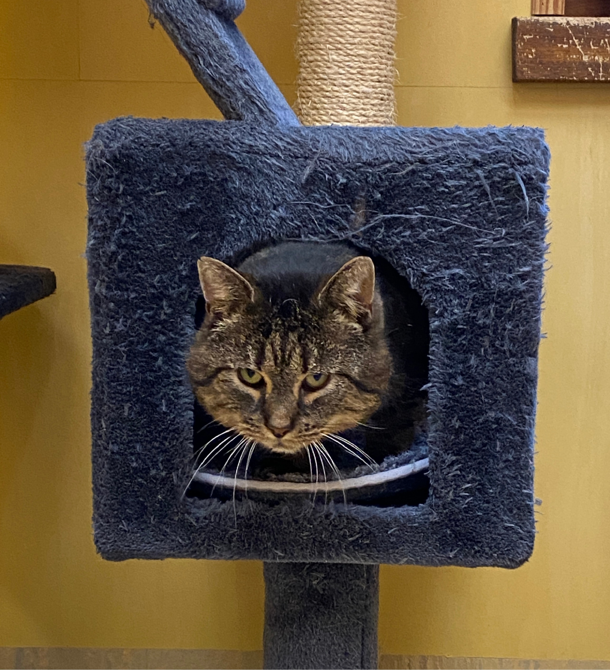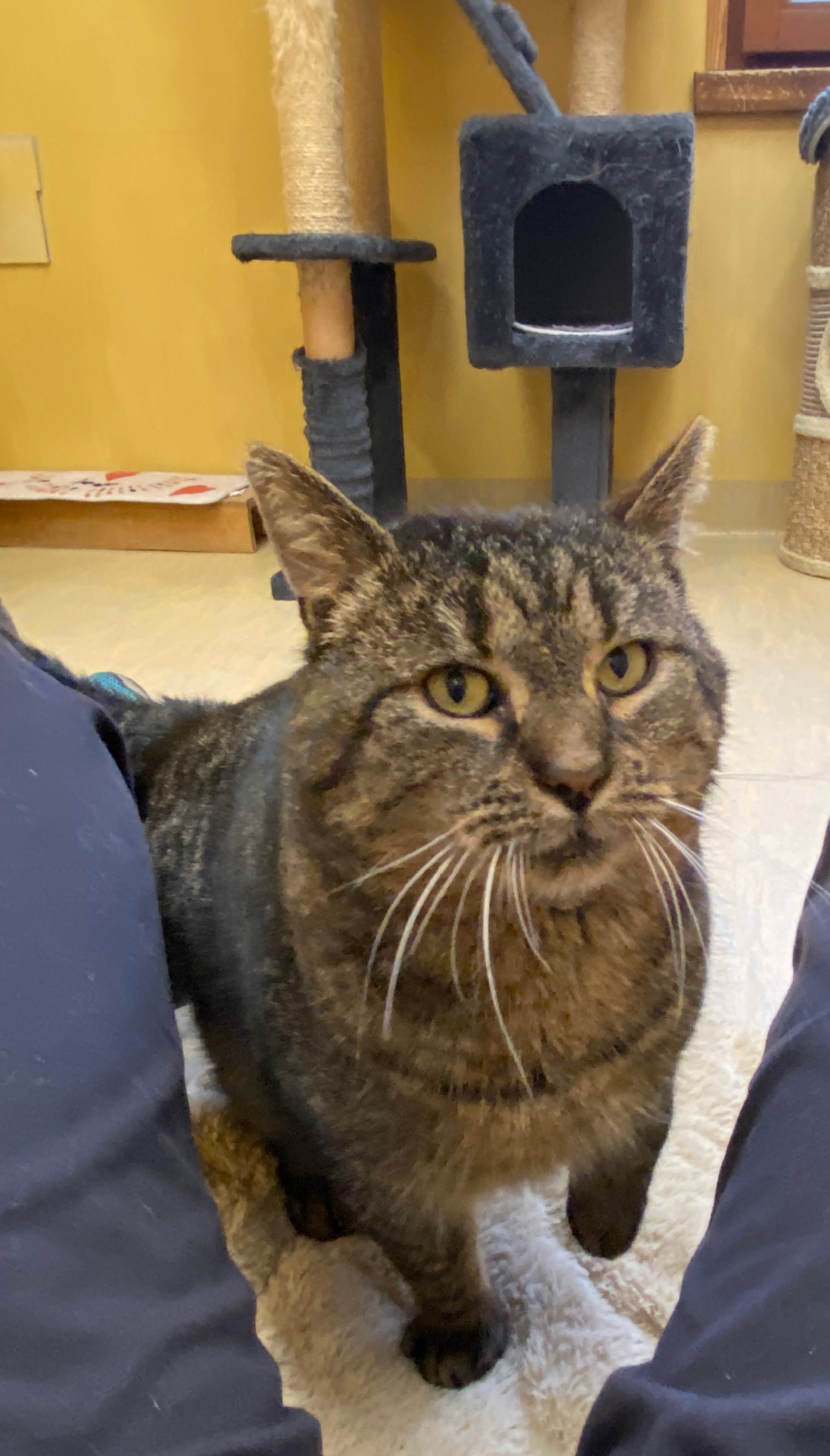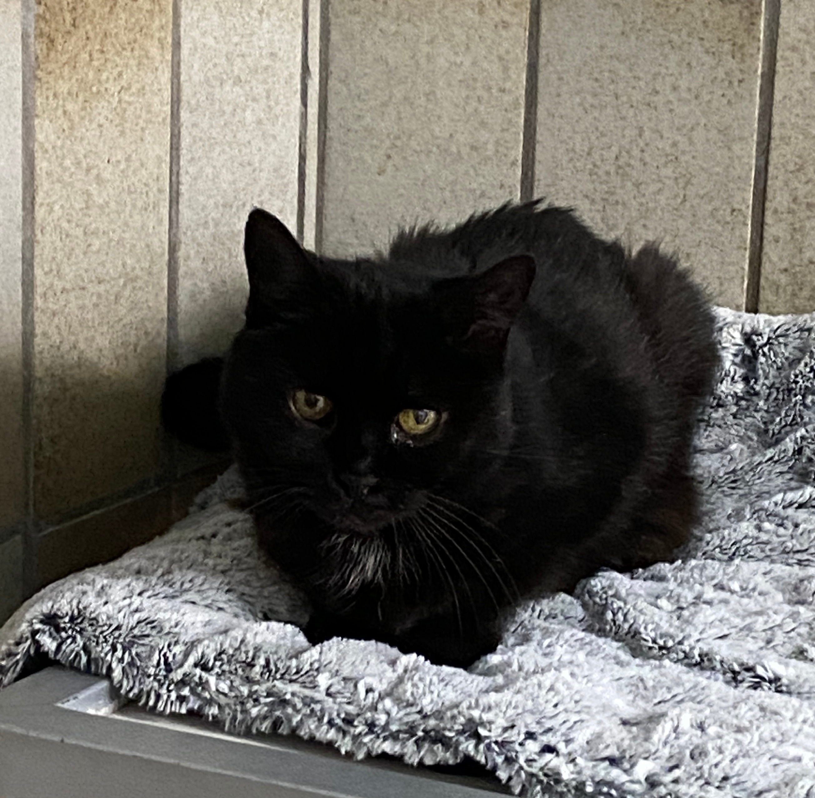 "Ich bin eine 10-jährige Katzendame, die sich ein gemütliches, liebevolles Zuhause wünscht. Lange Zeit habe ich auf der Straße gelebt. Eine nette Frau hat mich dort immer gefüttert – bis sie ins Altersheim ziehen musste. So kam ich ins Tierheim. Anfangs war alles für mich sehr ungewohnt, und ich brachte ein paar Baustellen mit : meine Zähne mussten gemacht werden (alles erledigt !), ich hatte Schnupfen und war so gestresst, dass ich fast nichts essen mochte, es gab Herzgeräusche, die sich zum Glück als unbedenklich herausgestellt haben, und ich habe eine alte Hornhautnarbe am Auge – die ist kosmetisch, bereitet mir aber keinerlei Probleme. Heute geht es mir wieder richtig gut. Ich fresse ordentlich, schnurre gern und genieße gemütliche Plätze (gerne in der Nähe von Aline). Jetzt bin ich bereit für mein eigenes Für-immer-Zuhause."