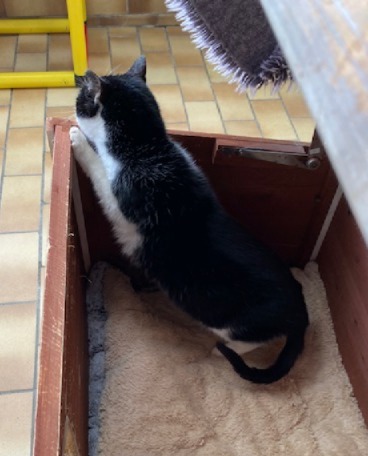 "Wir waren mehrere, die sich zum täglichen Mittagessen - ohne Verpflichtungen - bei einer älteren Dame einfanden. Allerlei Leckeres wurde dort aufgetischt, daher standen wir immer pünktlich auf der Matte. Zu unserem grössten Bedauern zog die nette Lady ins Altersheim, sodass unsere Futterquelle von jetzt auf gleich versiegt war. Deswegen war es nicht schwer, uns alle einzusammeln und ins Asile zu bringen. Mittlerweile lebe ich schon einige Monate hier im Tierheim. Noch immer bin ich sehr, sehr, sehr vorsichtig und habe bisher leider nicht gelernt, Menschen ganz zu vertrauen. Anfassen lasse ich mich daher noch nicht – dafür brauche ich einfach mehr Zeit. Es gibt aber auch gute Nachrichten : Für leckere Snacks bin ich immer zu haben, und dabei traue ich mich sogar schon ein kleines Stück näher heran. Jetzt, wo es draußen kälter wird, suche ich außerdem häufiger den warmen Innenbereich des Tierheims auf – ein kleines Zeichen dafür, dass ich mich langsam etwas wohler fühle."