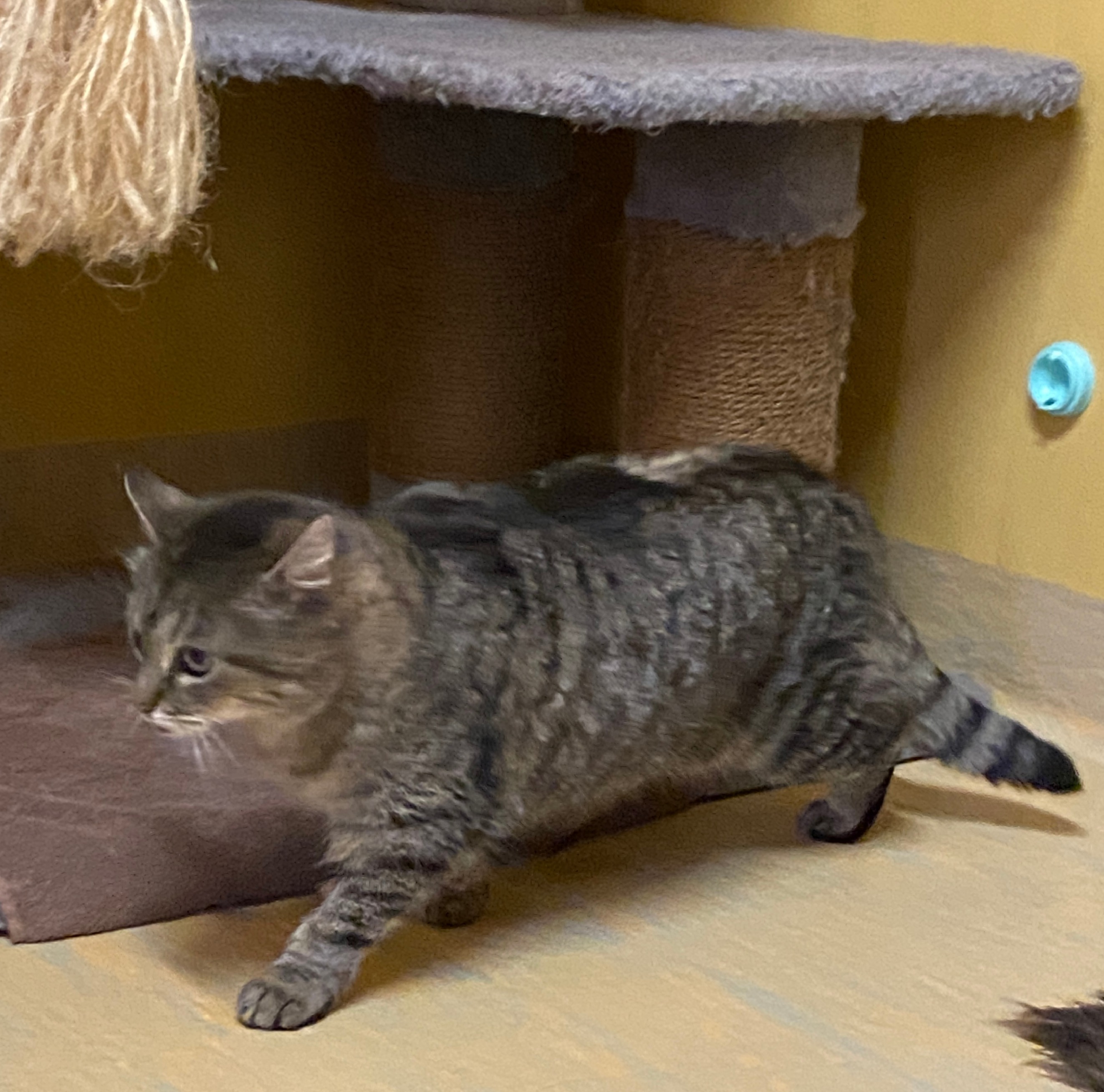 "Ich bin ein echter Wildling und habe mein bisheriges Leben ohne engen Kontakt zu Menschen verbracht. Seit einigen Monaten lebe ich nun im Tierheim. Am Anfang war mir alles unheimlich – da blieb mir nichts anderes übrig, als zu fauchen und zu spucken, um Abstand zu gewinnen. Inzwischen habe ich mich recht gut eingelebt. Leckerlis finde ich richtig spannend, sobald sie verteilt werden, bin ich sofort zur Stelle. Aber bitte erwartet nicht, mich anfassen zu dürfen – davor habe ich noch große Angst, und wenn jemand es versucht, flüchte ich sofort. Ich spiele gerne mit einer Schnur oder einem Ball. Für mich ist das ein Zeichen von Vertrauen und Neugier. Noch bin ich sehr vorsichtig, und ob oder wann ich mich streicheln lasse, wird die Zeit zeigen."
