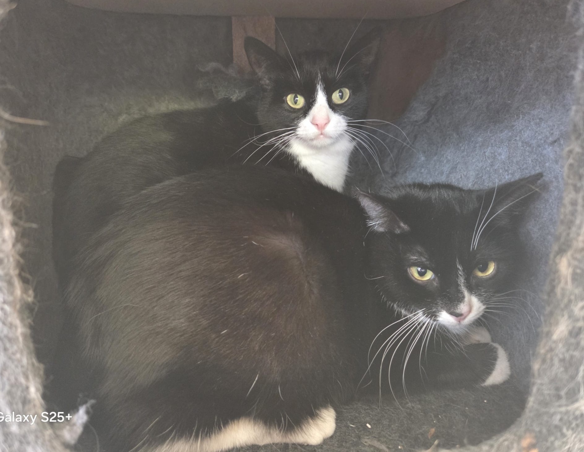 "Wir sind ein unzertrennliches Katzen-Duo und gehören fest zusammen. Bisher haben wir in einem Haushalt mit mehreren Katzen gelebt. Leider hatten unsere Menschen irgendwann nicht mehr genug Zeit für uns, deshalb sind wir nun im Tierheim gelandet. Wir sind zwei sehr liebe, freundliche Katzen und geben uns gegenseitig viel Halt. Wir spielen zusammen, ruhen zusammen und fühlen uns einfach am wohlsten, wenn wir beieinander sind. Deshalb möchten wir unbedingt gemeinsam in ein neues Zuhause ziehen. Wer hat ein Herz für zwei verschmuste Freunde, die zusammen die Welt erkunden und ihr Zuhause mit Leben füllen möchten ?"
