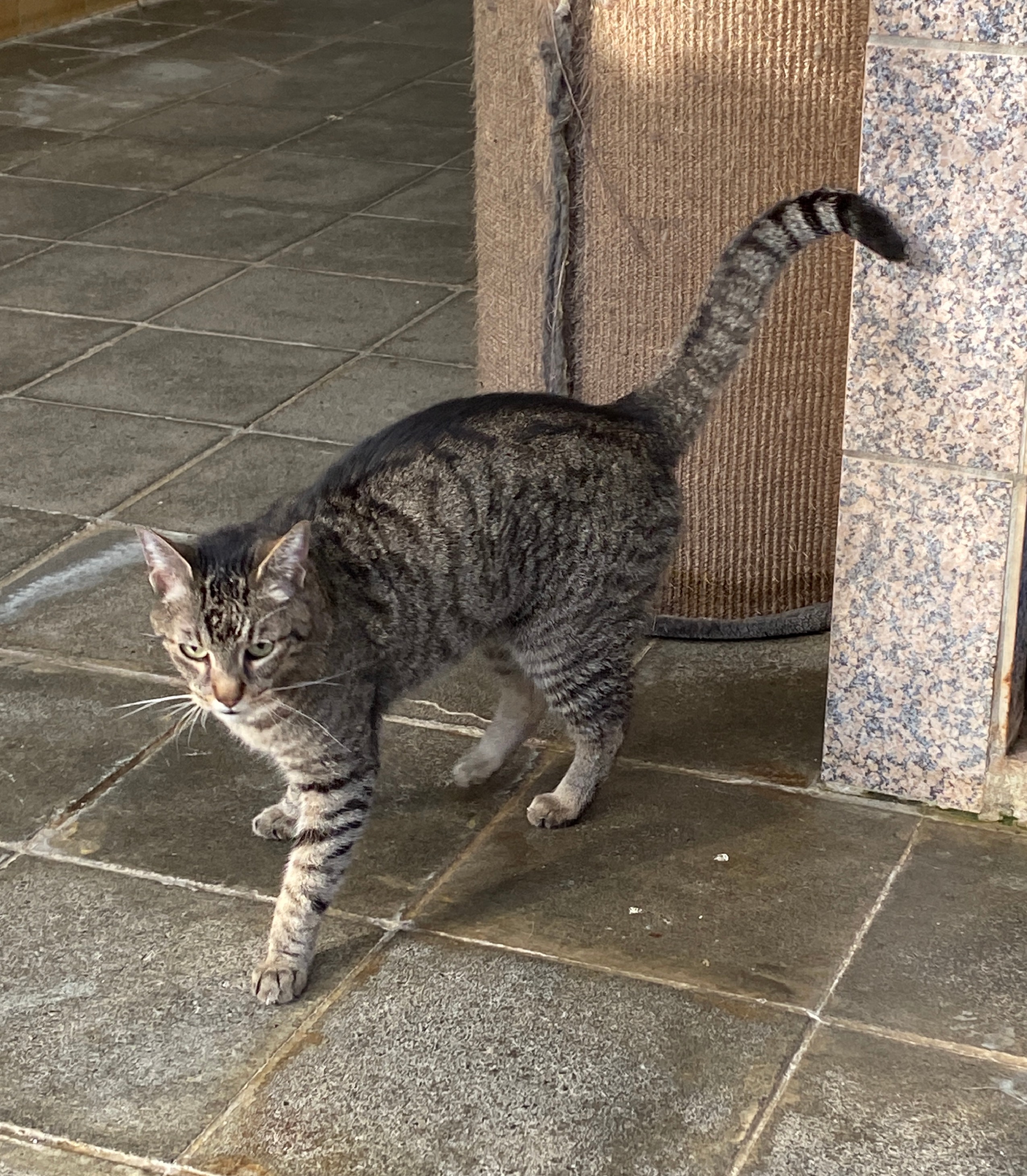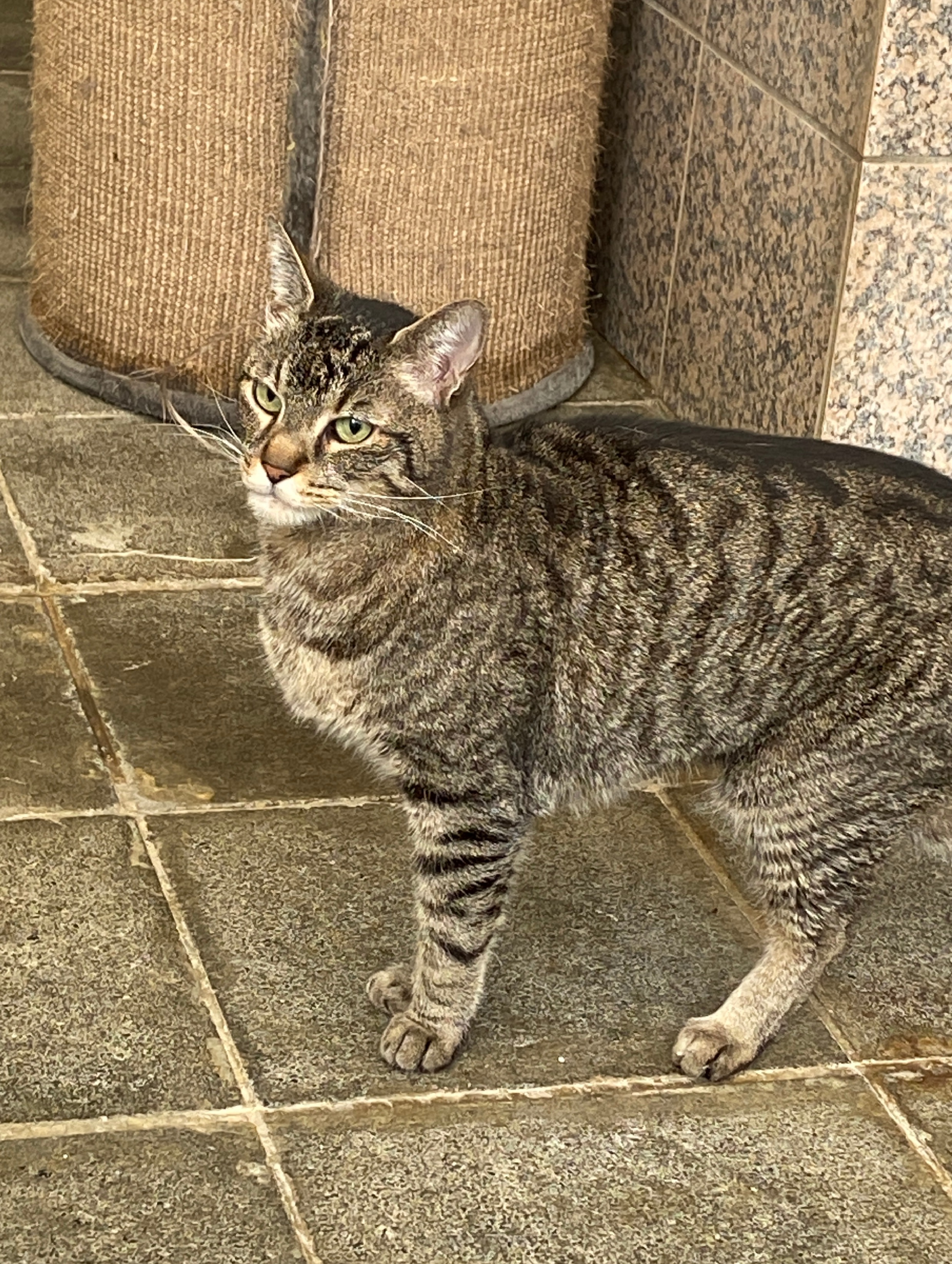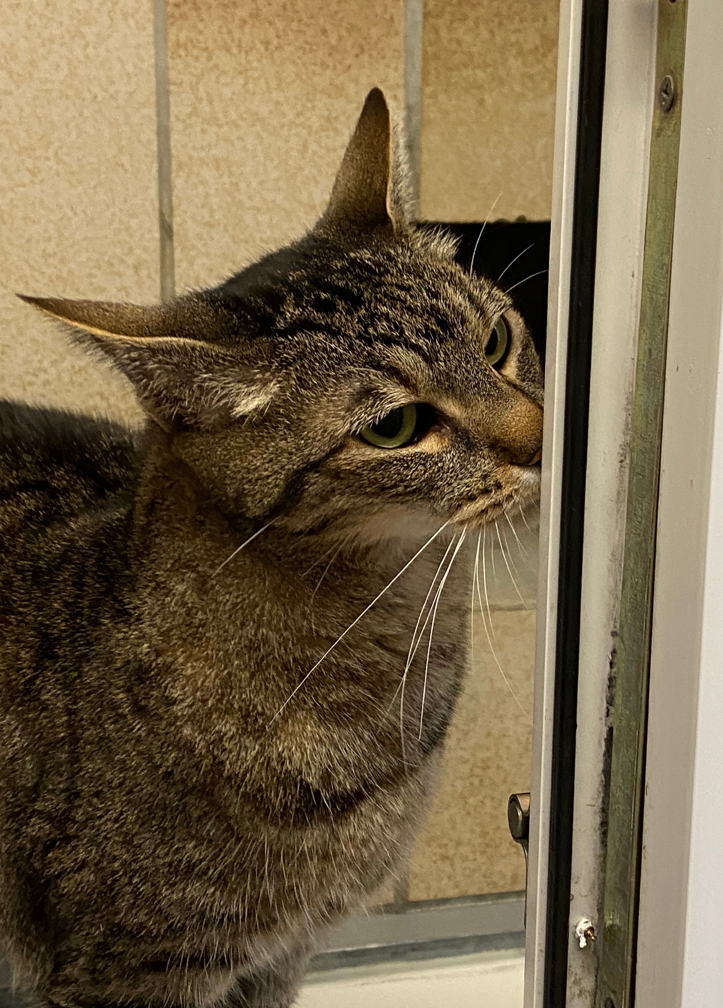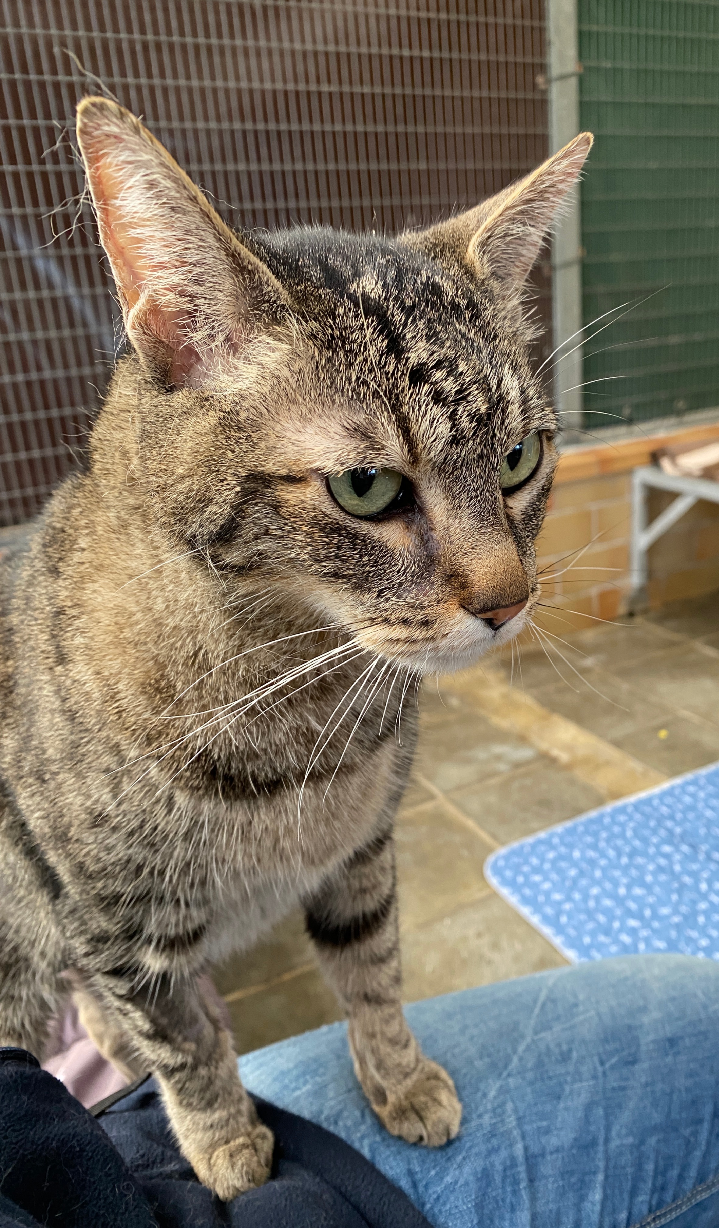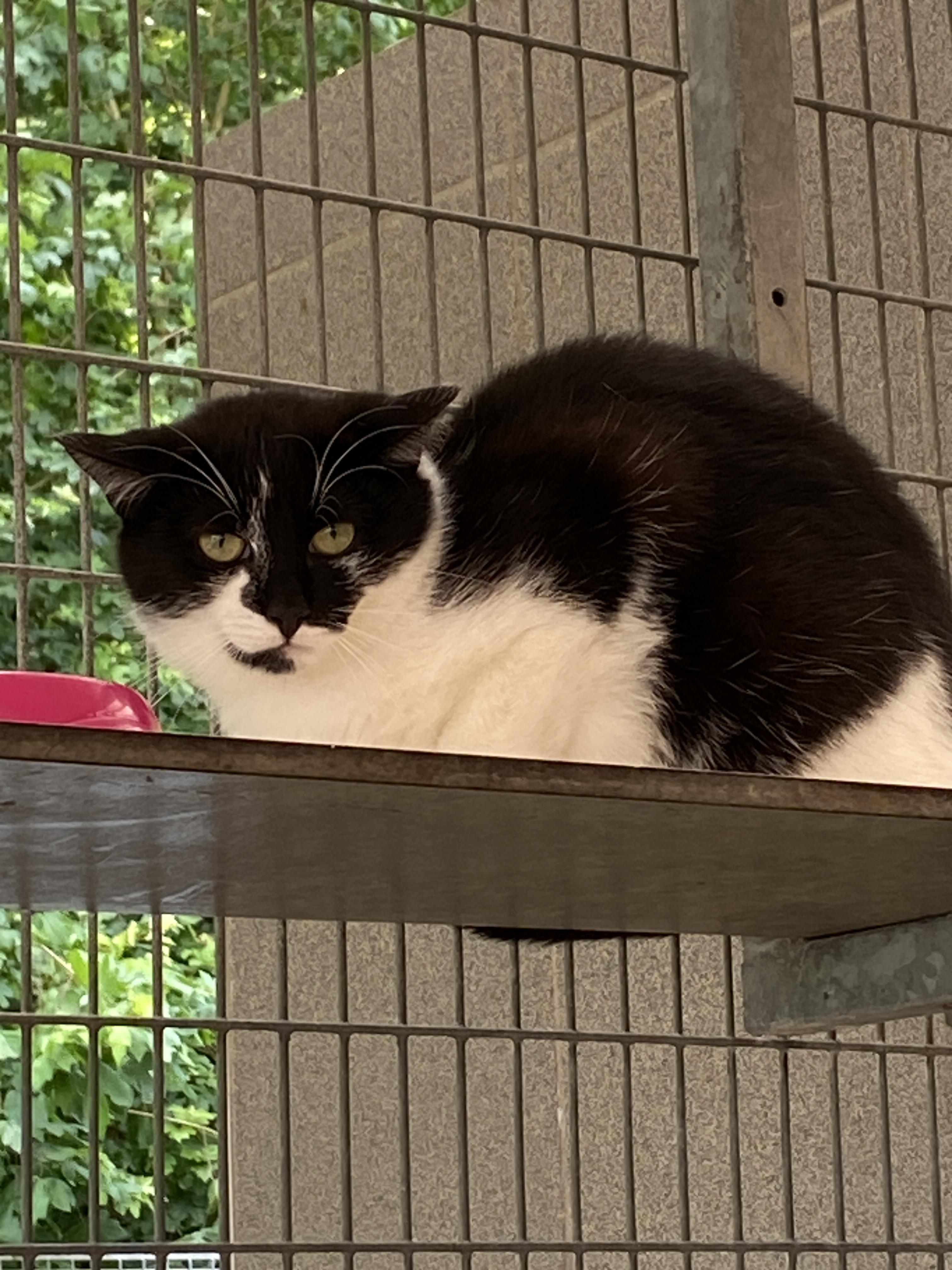 "Wir waren mehrere, die sich zum täglichen Mittagessen - ohne Verpflichtungen - bei einer älteren Dame einfanden. Allerlei Leckeres wurde dort aufgetischt, daher standen wir immer pünktlich auf der Matte. Zu unserem grössten Bedauern zog die nette Lady ins Altersheim, sodass unsere Futterquelle von jetzt auf gleich versiegt war. Deswegen war es nicht schwer, uns alle einzusammeln und ins Asile zu bringen. Mittlerweile lebe ich schon einige Monate hier im Tierheim. Noch immer bin ich sehr, sehr, sehr vorsichtig und habe bisher leider nicht gelernt, Menschen ganz zu vertrauen. Anfassen lasse ich mich daher noch nicht – dafür brauche ich einfach mehr Zeit. Es gibt aber auch gute Nachrichten : Für leckere Snacks bin ich immer zu haben, und dabei traue ich mich sogar schon ein kleines Stück näher heran. Jetzt, wo es draußen kälter wird, suche ich außerdem häufiger den warmen Innenbereich des Tierheims auf – ein kleines Zeichen dafür, dass ich mich langsam etwas wohler fühle."