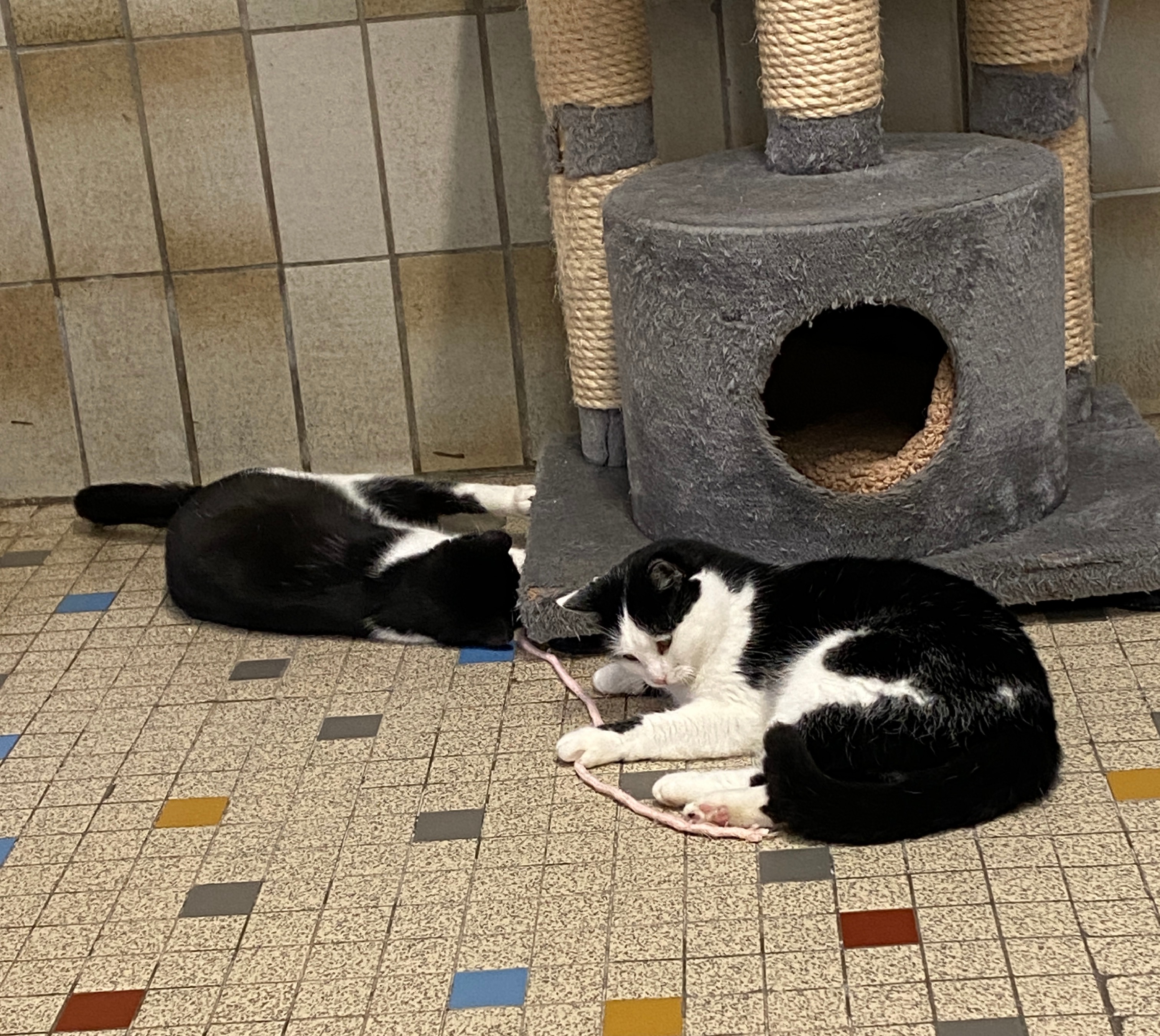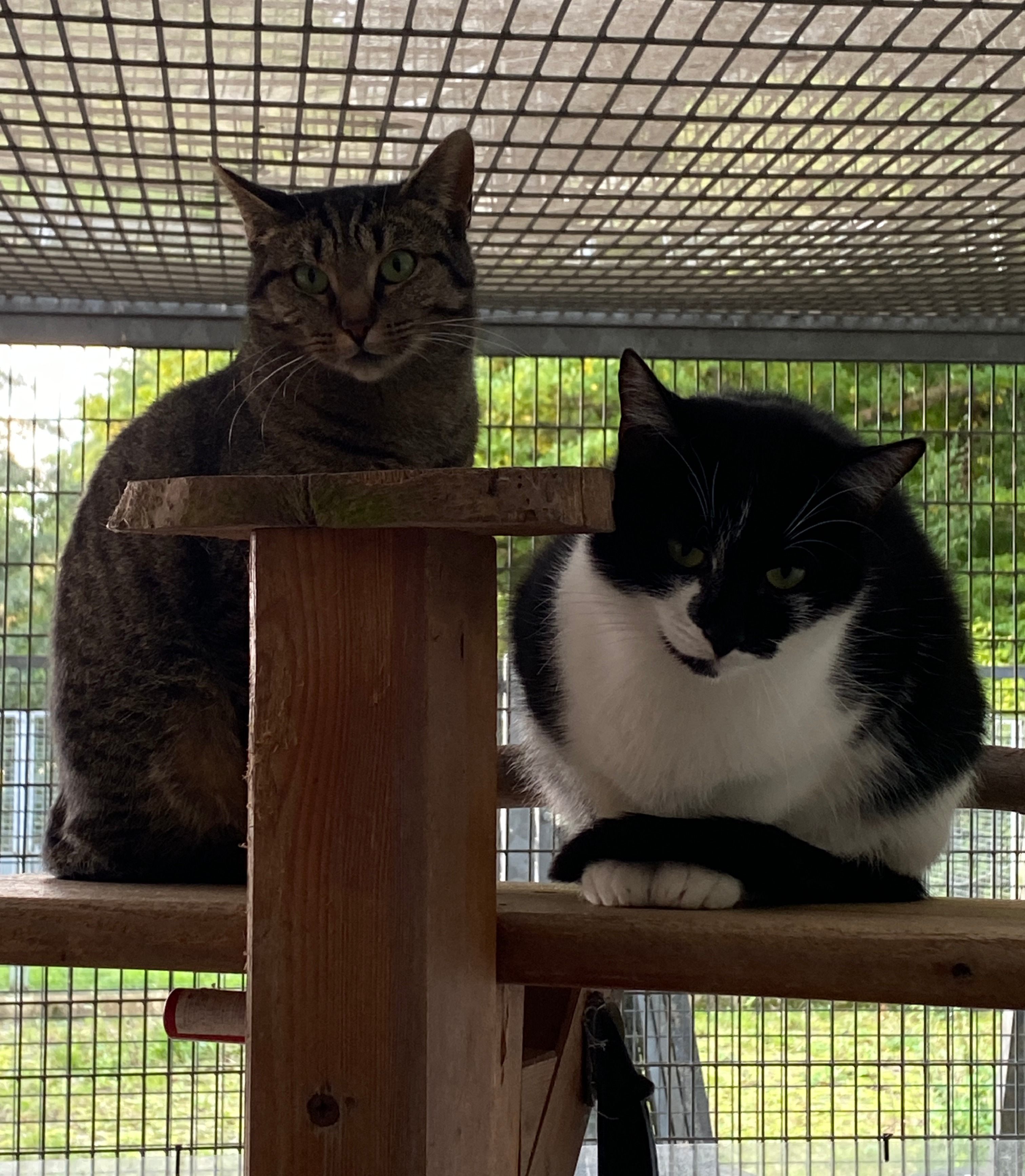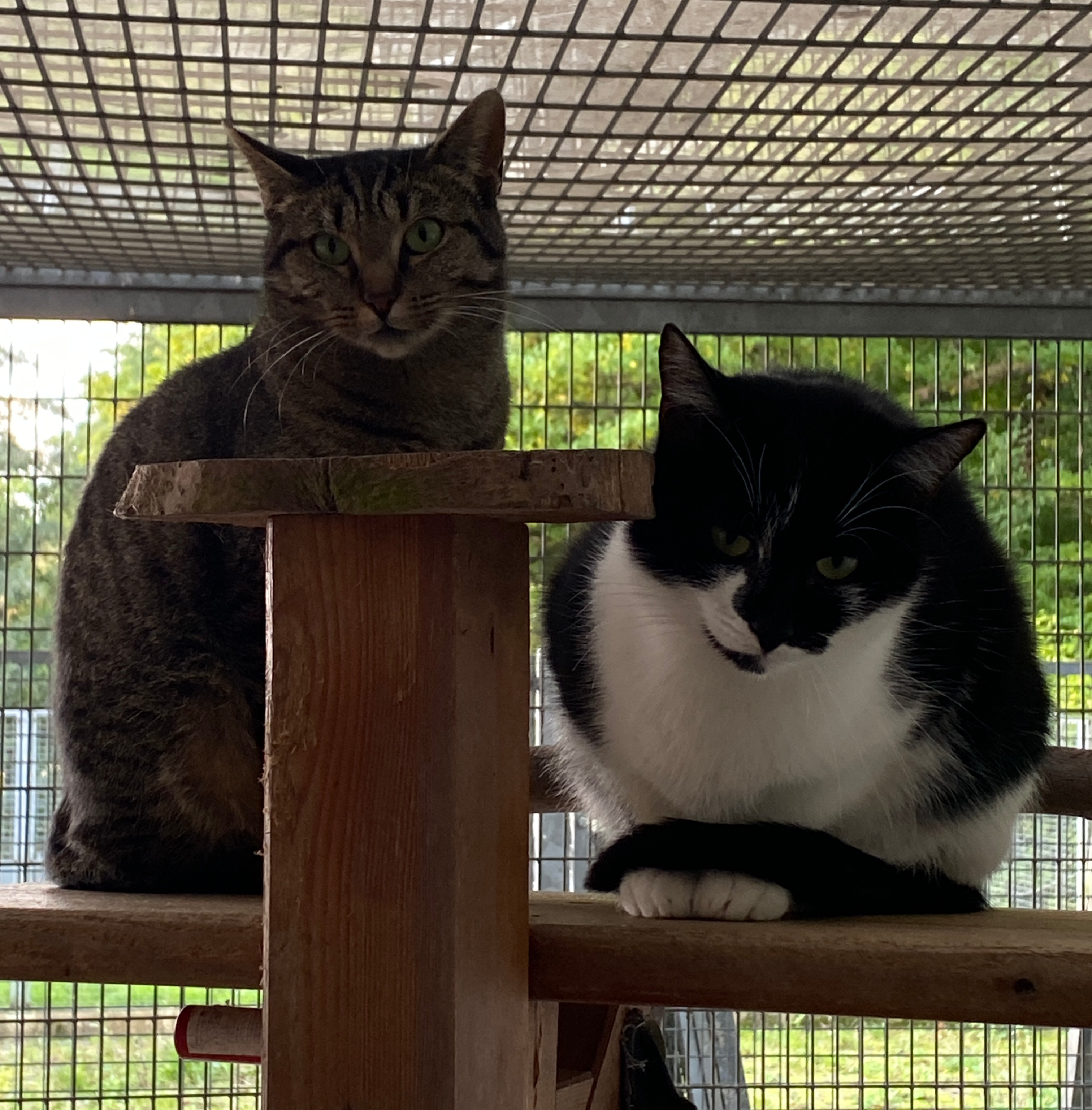 "Wir waren mehrere, die sich zum täglichen Mittagessen - ohne Verpflichtungen - bei einer älteren Dame einfanden. Allerlei Leckeres wurde dort aufgetischt, daher standen wir immer pünktlich auf der Matte. Zu unserem grössten Bedauern zog die nette Lady ins Altersheim, sodass unsere Futterquelle von jetzt auf gleich versiegt war. Deswegen war es nicht schwer, uns alle einzusammeln und ins Asile zu bringen. Das Wichtigste : auch hier stimmt die Verpflegung. Unsere Freundin Blake ist schon auf einem Bauernhof untergekommen - ein Traum auch für Brutus und mich. Größtmögliche Freiheit mit gesichertem Futterplatz, das wär's ! Angefasst werden möchte ich weiterhin nicht."