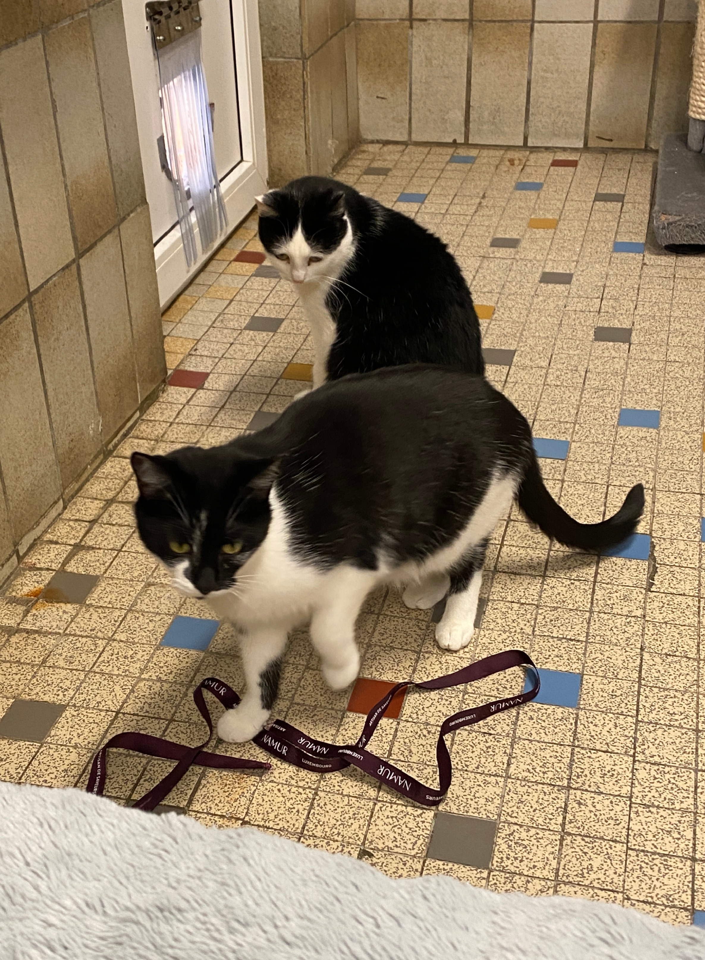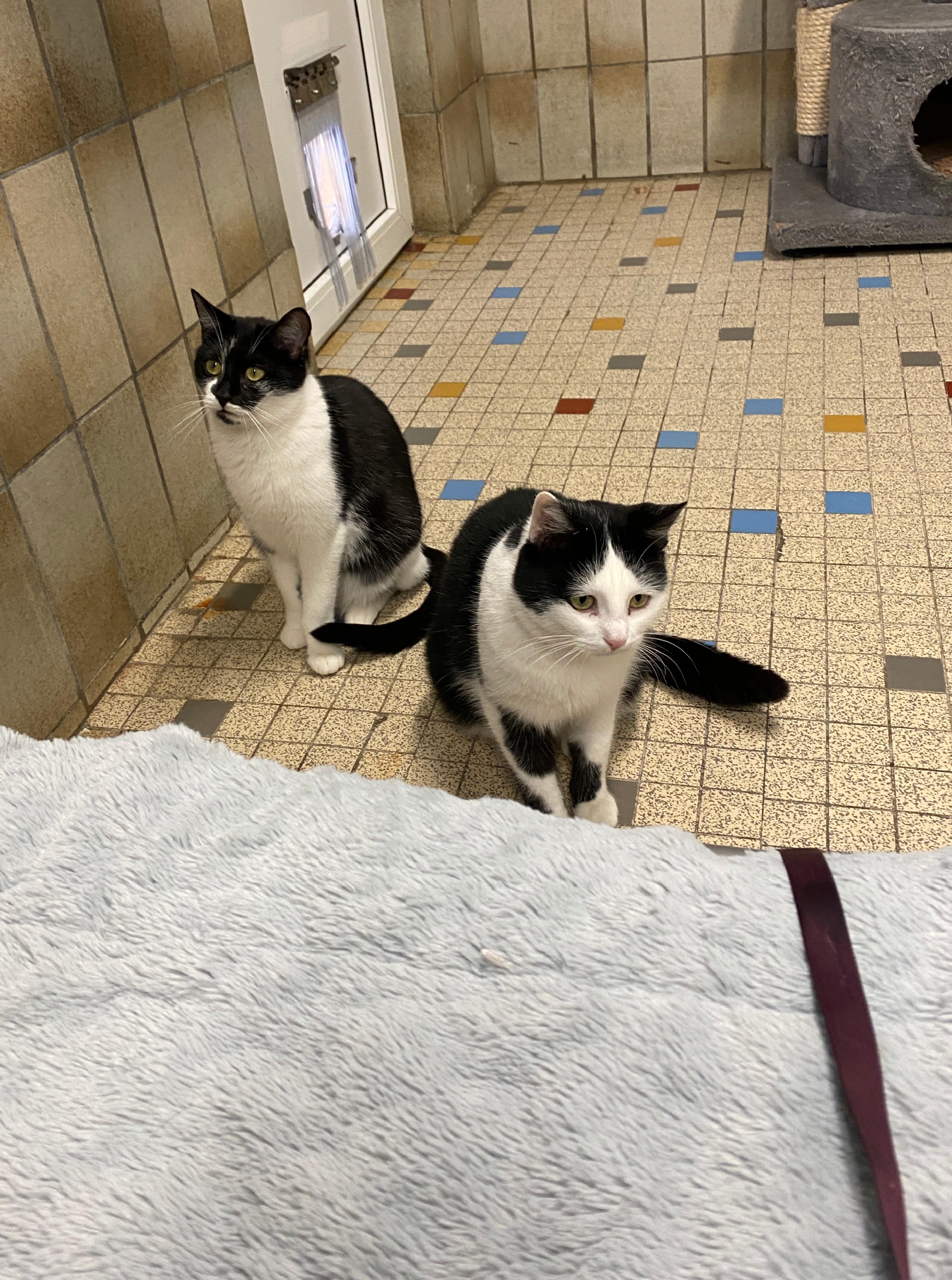 "Wir waren mehrere, die sich zum täglichen Mittagessen - ohne Verpflichtungen - bei einer älteren Dame einfanden. Allerlei Leckeres wurde dort aufgetischt, daher standen wir immer pünktlich auf der Matte. Zu unserem grössten Bedauern zog die nette Lady ins Altersheim, sodass unsere Futterquelle von jetzt auf gleich versiegt war. Deswegen war es nicht schwer, uns alle einzusammeln und ins Asile zu bringen. Das Wichtigste : auch hier stimmt die Verpflegung. Unsere Freundin Blake ist schon auf einem Bauernhof untergekommen - ein Traum auch für Brooke und mich. Größtmögliche Freiheit mit gesichertem Futterplatz, das wär's ! Angefasst werden möchte ich weiterhin nicht."