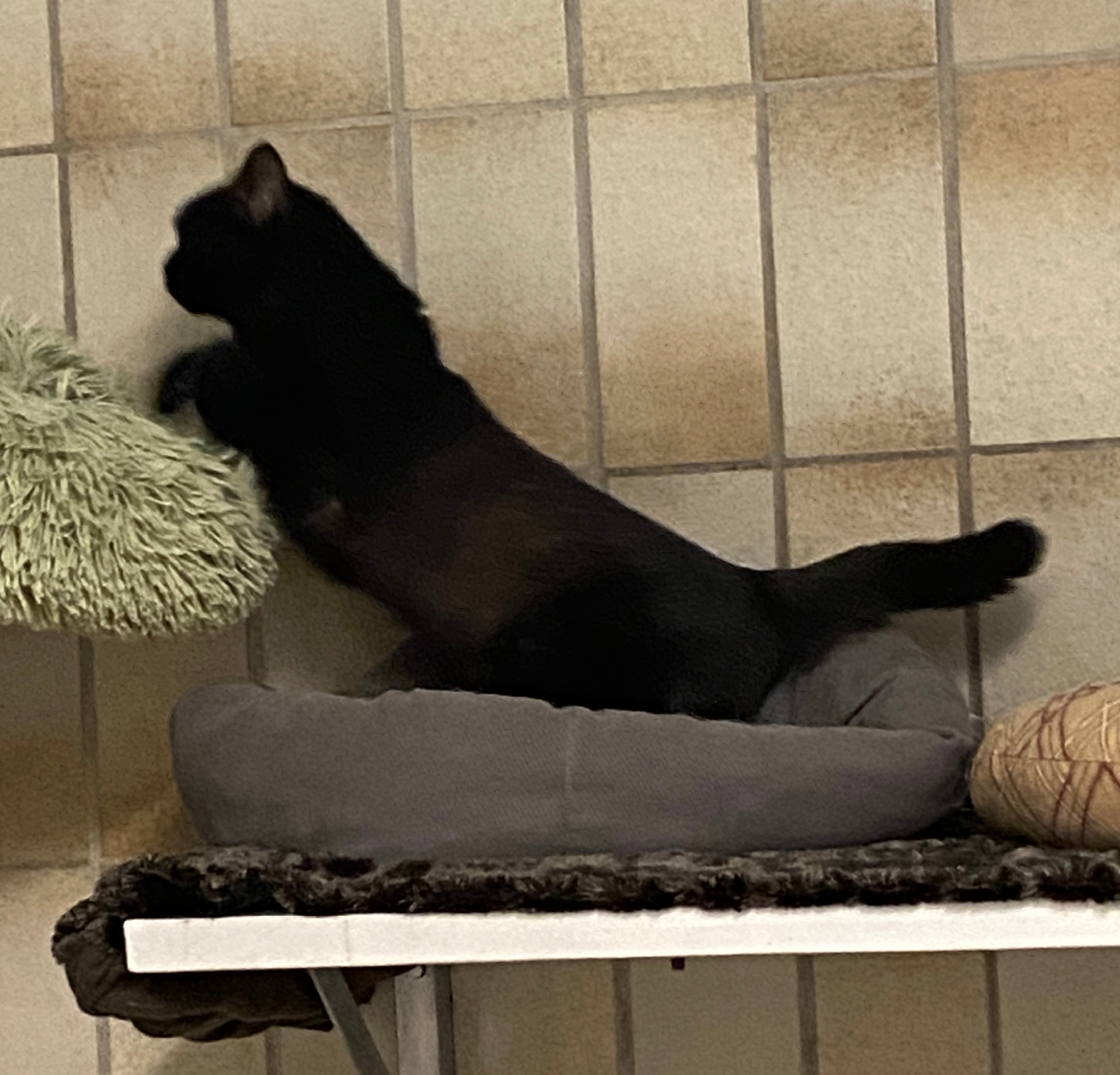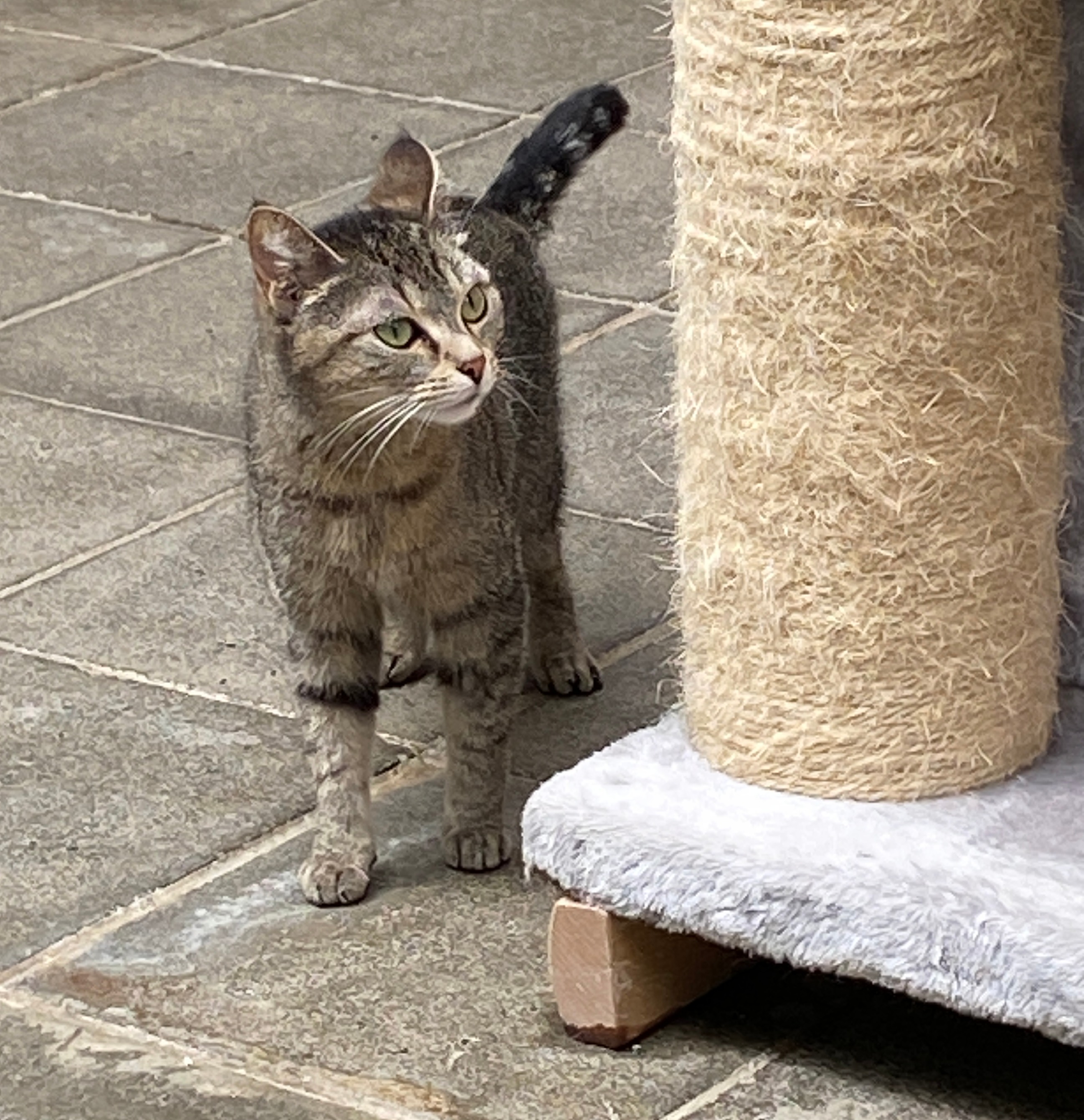 "Wir waren mehrere, die sich zum täglichen Mittagessen - ohne Verpflichtungen - bei einer älteren Dame einfanden. Allerlei Leckeres wurde dort aufgetischt, daher standen wir immer pünktlich auf der Matte. Zu unserem grössten Bedauern zog die nette Lady ins Altersheim, sodass unsere Futterquelle von jetzt auf gleich versiegt war. Deswegen war es nicht schwer, uns alle einzusammeln und ins Asile zu bringen. Mittlerweile lebe ich schon einige Monate hier im Tierheim. Noch immer bin ich sehr vorsichtig und habe bisher leider nicht gelernt, Menschen ganz zu vertrauen. Anfassen lasse ich mich daher noch nicht – dafür brauche ich einfach mehr Zeit. Es gibt aber auch gute Nachrichten : Für leckere Snacks bin ich immer zu haben, und dabei traue ich mich sogar schon ein kleines Stück näher heran. Manchmal spiele ich sogar vorsichtig mit einer Schnur – ein kleiner Moment, in dem meine Neugier gewinnt. Jetzt, wo es draußen kälter wird, suche ich außerdem häufiger den warmen Innenbereich des Tierheims auf – ein kleines Zeichen dafür, dass ich mich langsam etwas wohler fühle."
