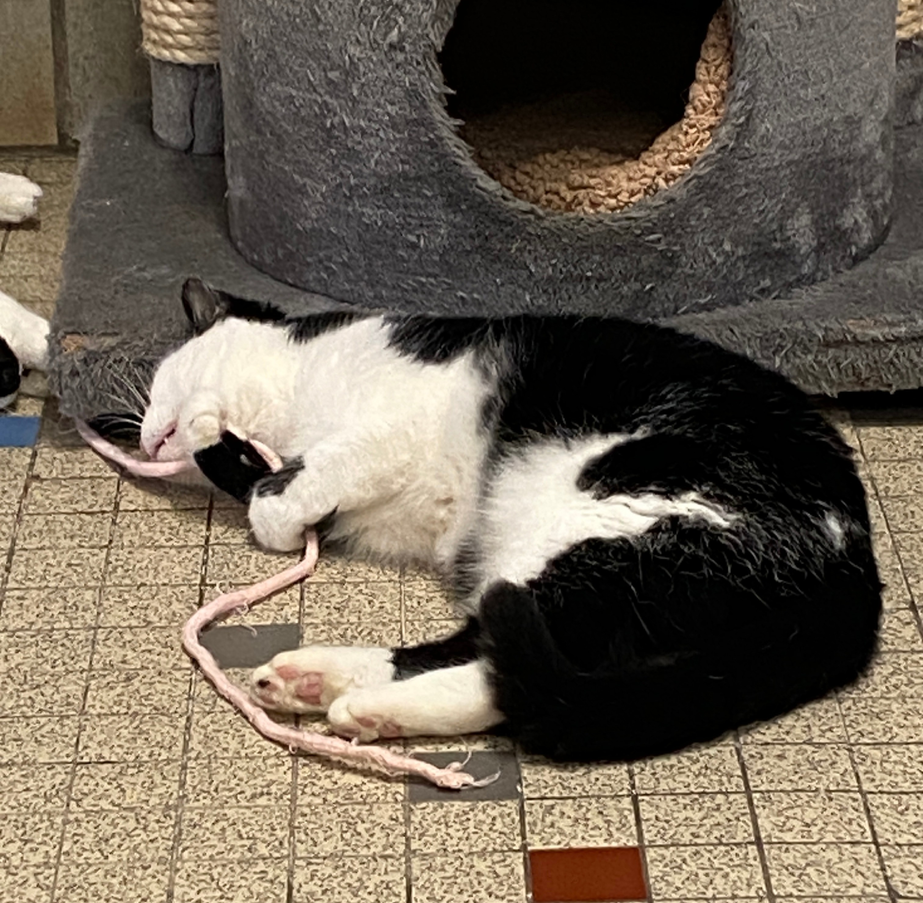 "Ich wurde zusammen mit meiner Partnerin Henriette und unserem gemeinsamen Nachwuchs, Baby Henriette bei einer Lagerhalle aufgelesen. Wir sind klassische Wildlinge : nicht sozialisiert, wir fauchen und spucken, sobald sich uns jemand nähert. Unsere Vorfahren gehörten wohl zu einer frei lebenden Katzenpopulation. Ob wir jemals Vertrauen fassen, wird sich zeigen."