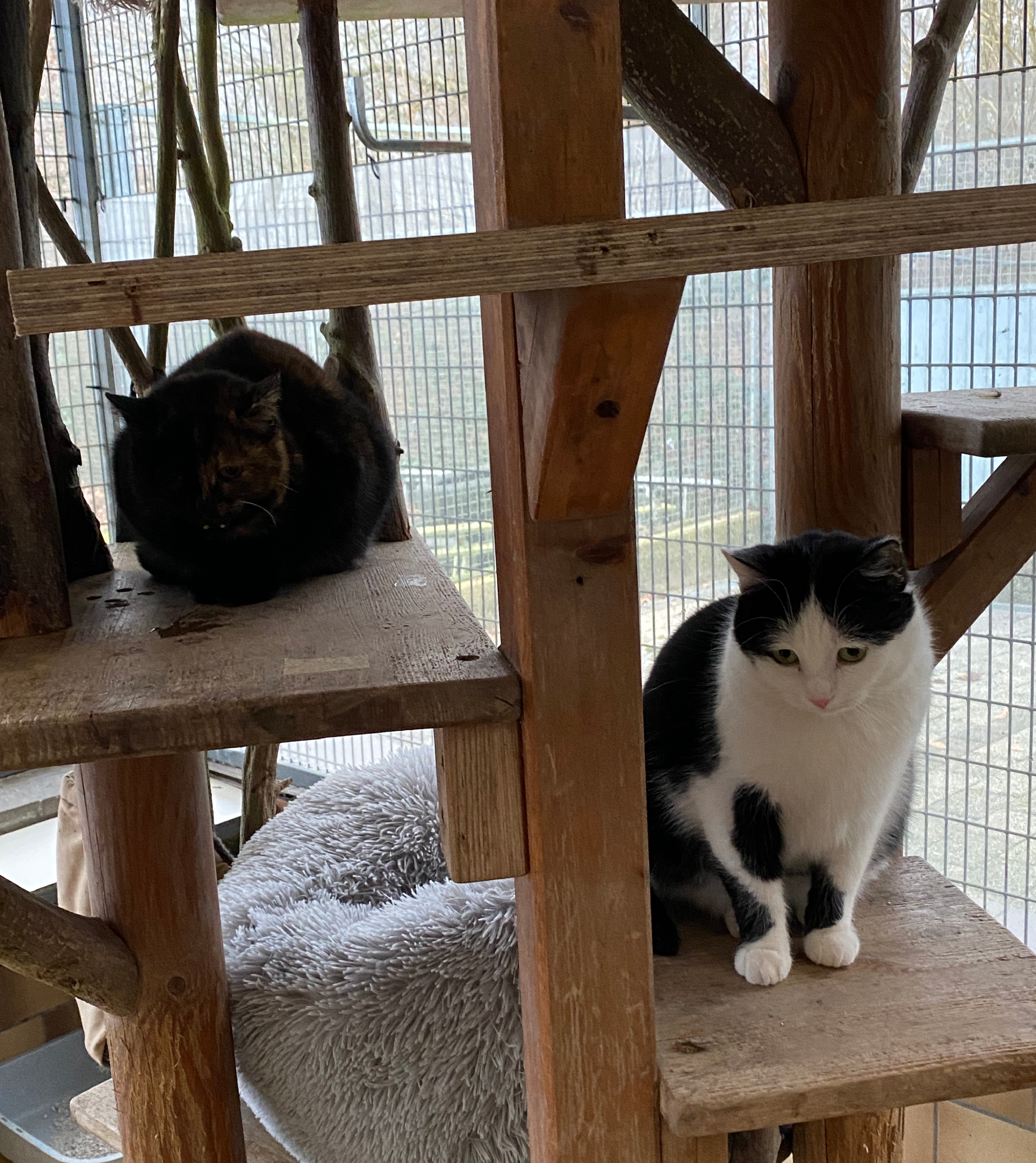 "Wir sind die letzten von mehreren Kitten und suchen noch ein passendes Zuhause. Wir sind mittlerweile etwa 8 Monate alt. Ich, Pustel, bin noch recht scheu, zeige aber Fortschritte : ich spiele inzwischen neugierig, mag mich aber noch nicht anfassen lassen. Meine Mitbewohnerin Henrietta ist weiterhin sehr misstrauisch. Sie zieht sich überwiegend in die Höhle des Kratzbaums zurück, faucht und kratzt bei Annäherung und kommt nur hervor, wenn keine Menschen in der Nähe sind. Ich tue mein Bestes, sie aus ihrem Schneckenhaus zu locken - bislang allerdings mit eher mäßigem Erfolg. Naja, die Hoffnung stirbt zuletzt. Immerhin : wenigstens Leckerlis kann Henrietta nicht widerstehen. Wir suchen sehr geduldige, katzenerfahrene Menschen, die uns beiden Zeit geben und keine Erwartungen an schnelle Nähe oder Schmusebedürftigkeit haben. Ein ruhiges Umfeld ohne Kinder ist Voraussetzung, später auch unbedingt Freigang."