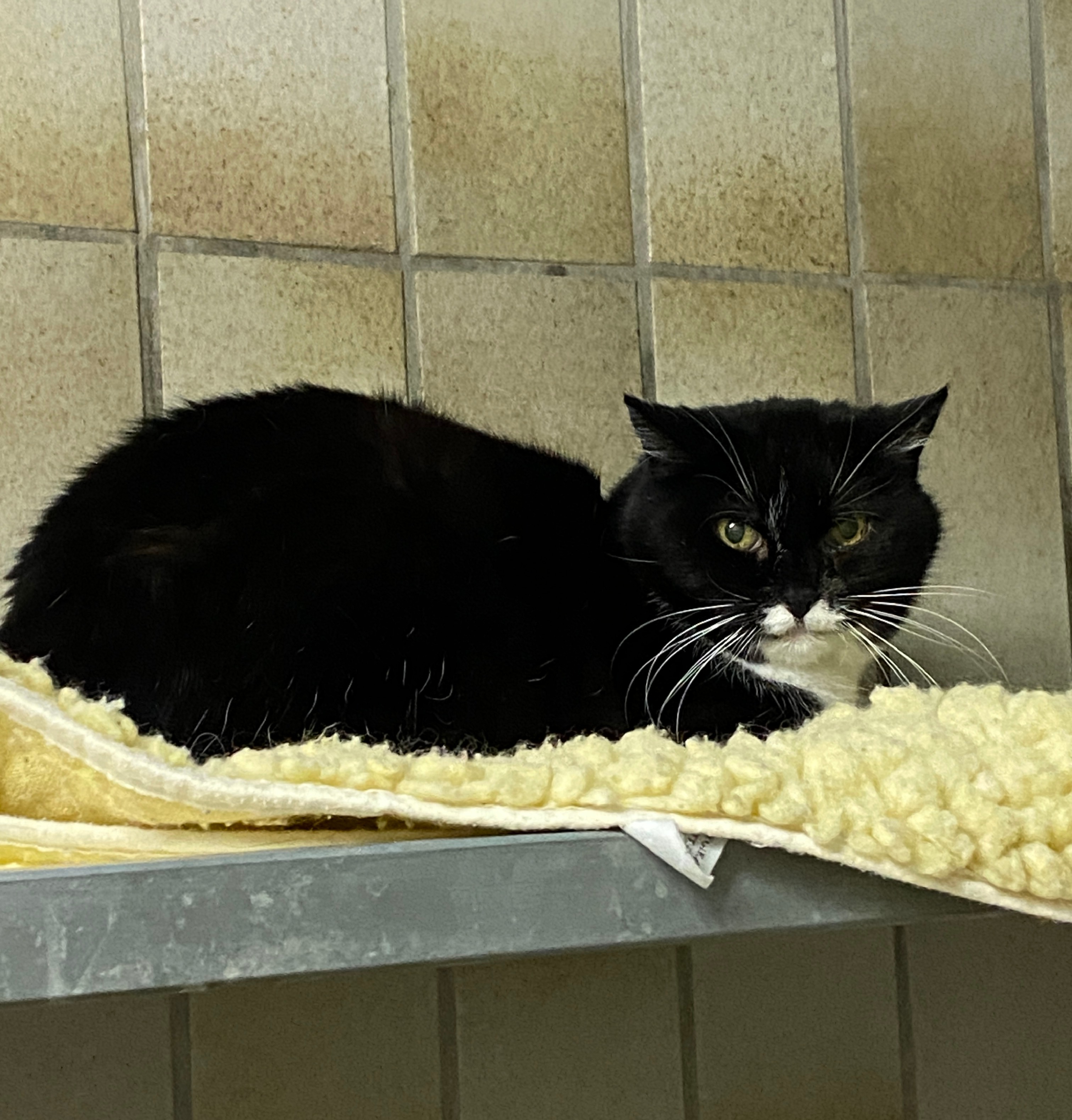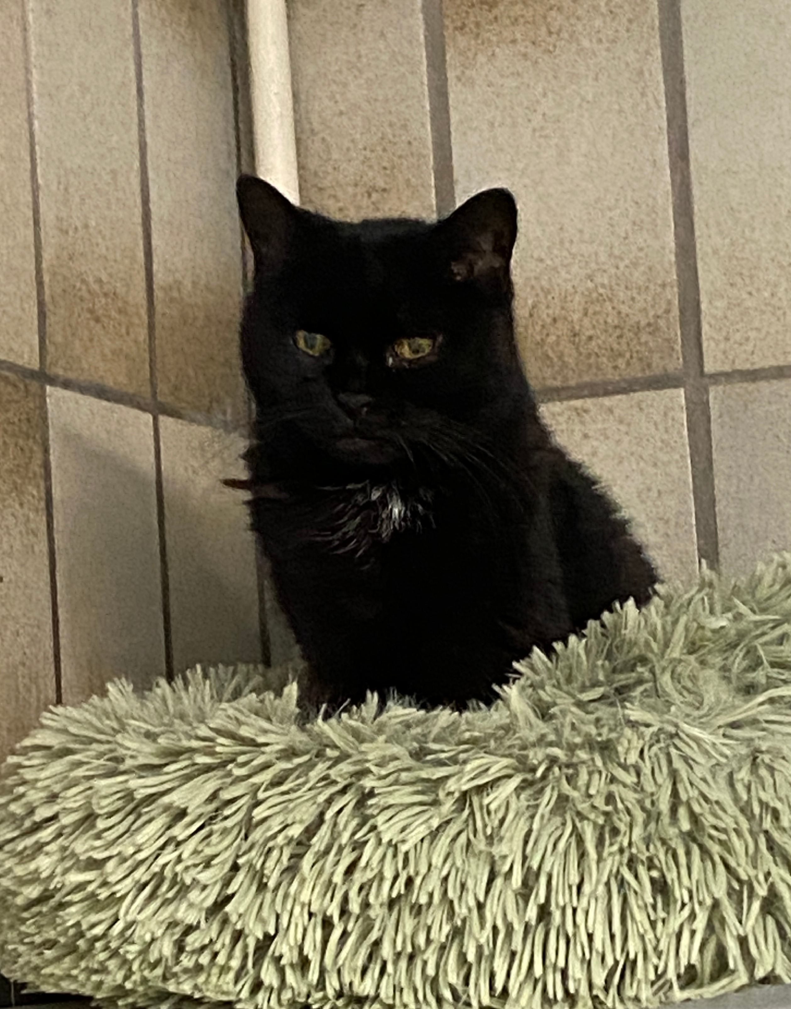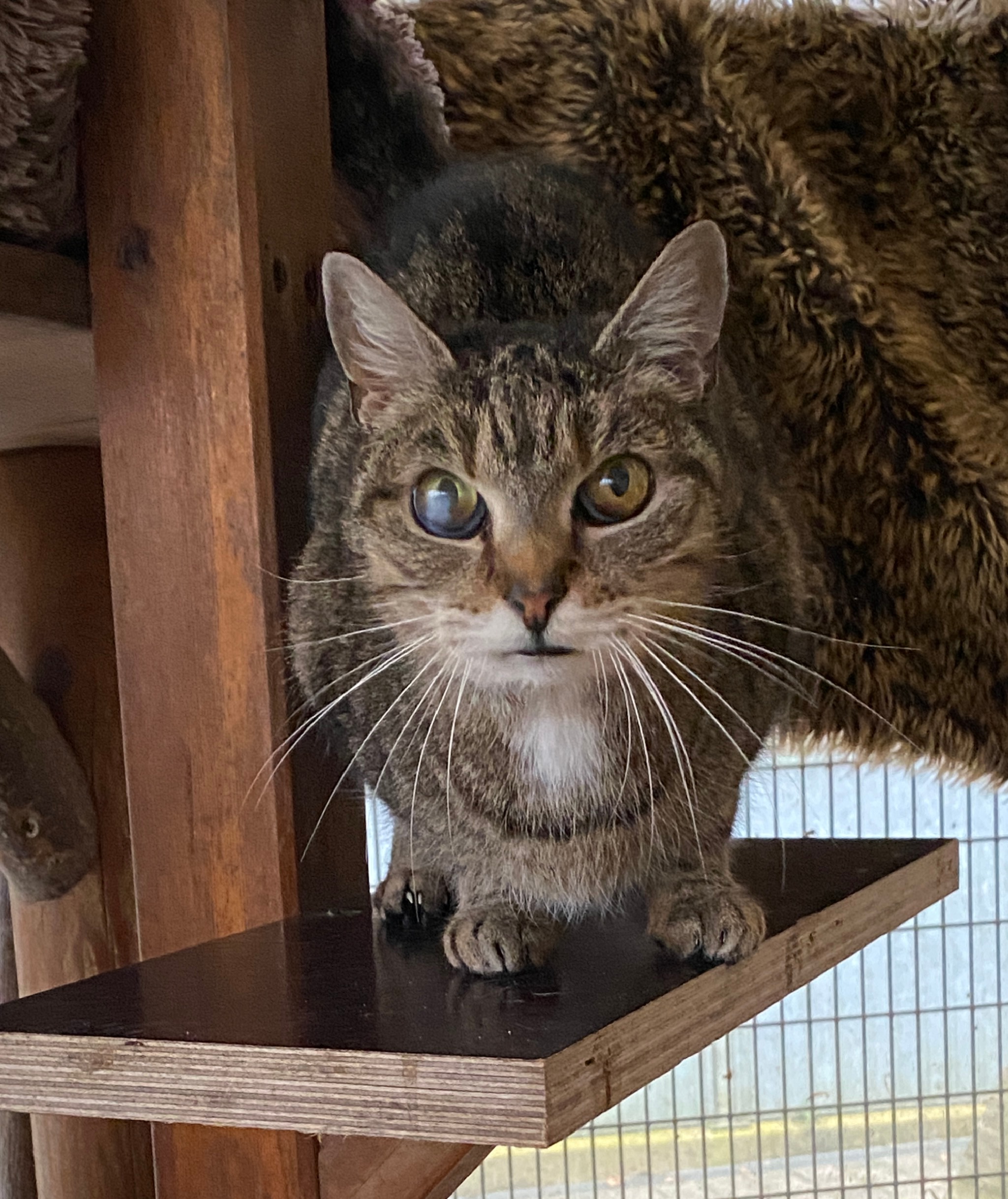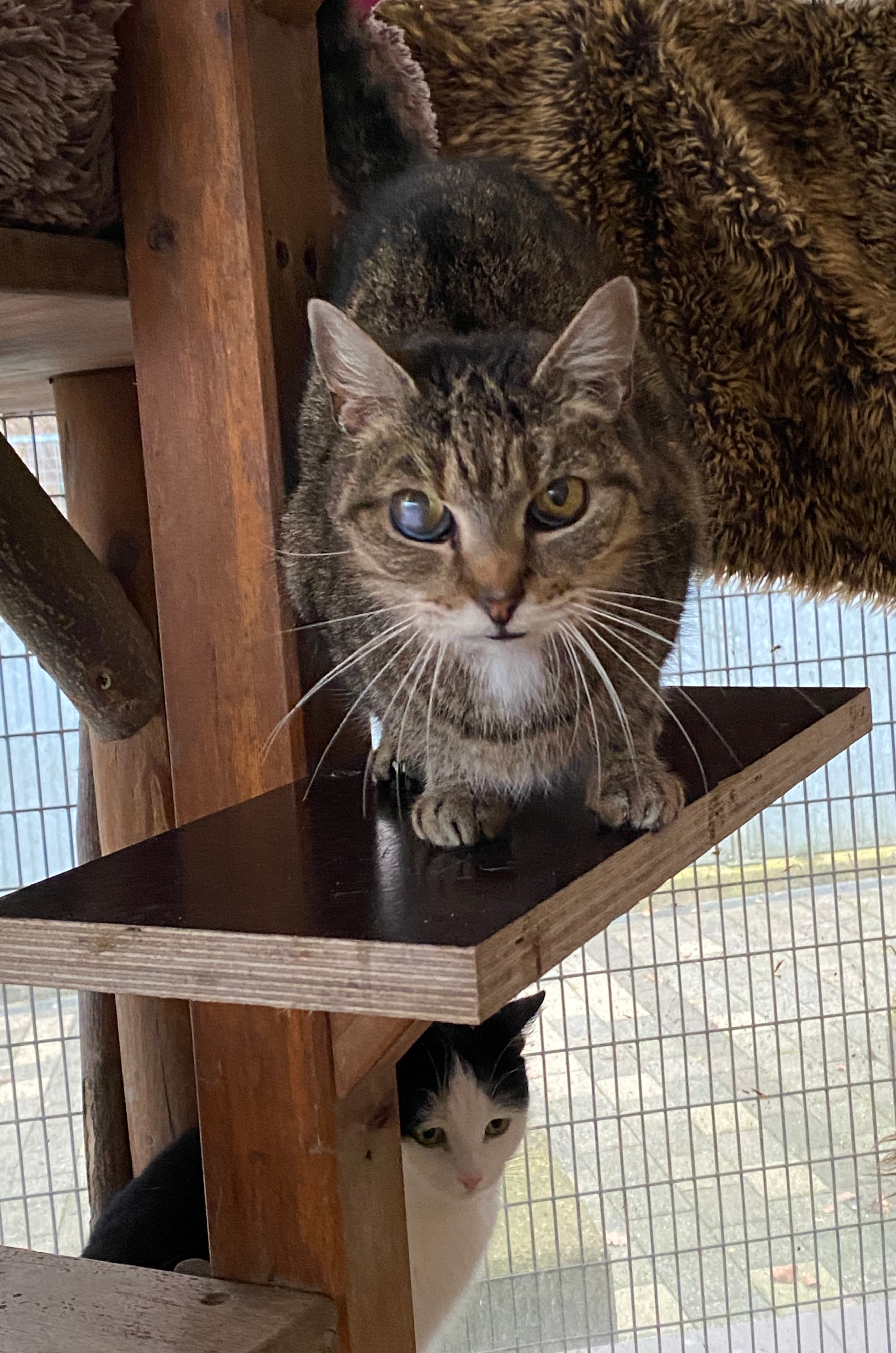 "Ich bin eine 10-jährige Katzendame, die sich ein gemütliches, liebevolles Zuhause wünscht. Lange Zeit habe ich auf der Straße gelebt. Eine nette Frau hat mich dort immer gefüttert – bis sie ins Altersheim ziehen musste. So kam ich ins Tierheim. Anfangs war alles für mich sehr ungewohnt, und ich brachte ein paar Baustellen mit : meine Zähne mussten gemacht werden (alles erledigt !), ich hatte Schnupfen und war so gestresst, dass ich fast nichts essen mochte, es gab Herzgeräusche, die sich zum Glück als unbedenklich herausgestellt haben, und ich habe eine alte Hornhautnarbe am Auge – die ist kosmetisch, bereitet mir aber keinerlei Probleme. Heute geht es mir wieder richtig gut. Ich fresse ordentlich, schnurre gern und genieße gemütliche Plätze (gerne in der Nähe von Aline). Jetzt bin ich bereit für mein eigenes Für-immer-Zuhause."