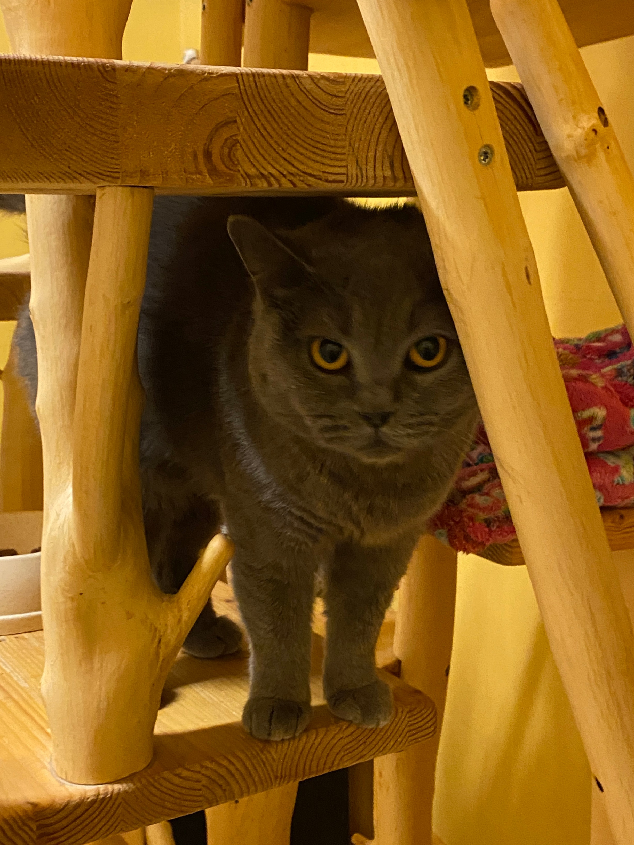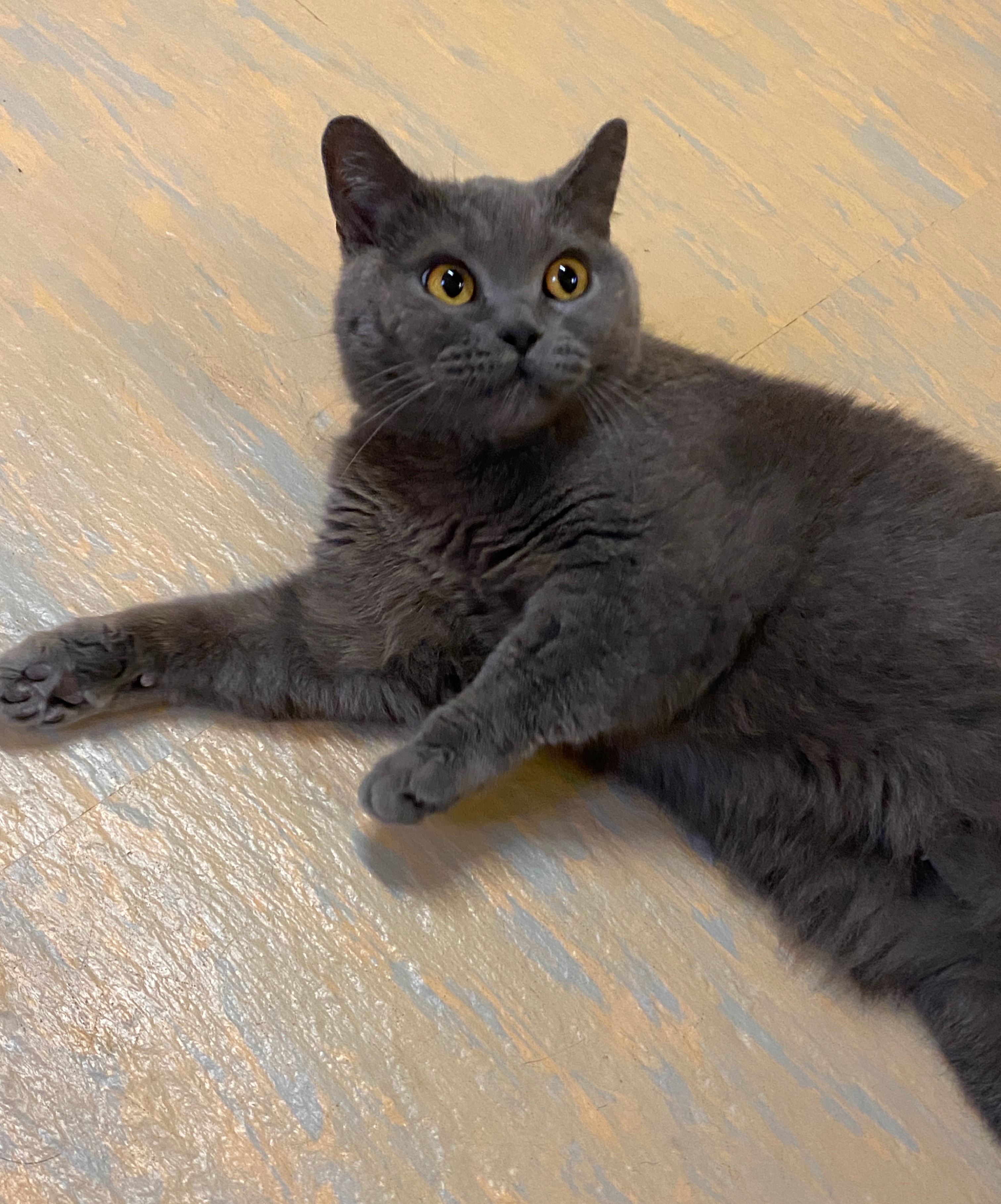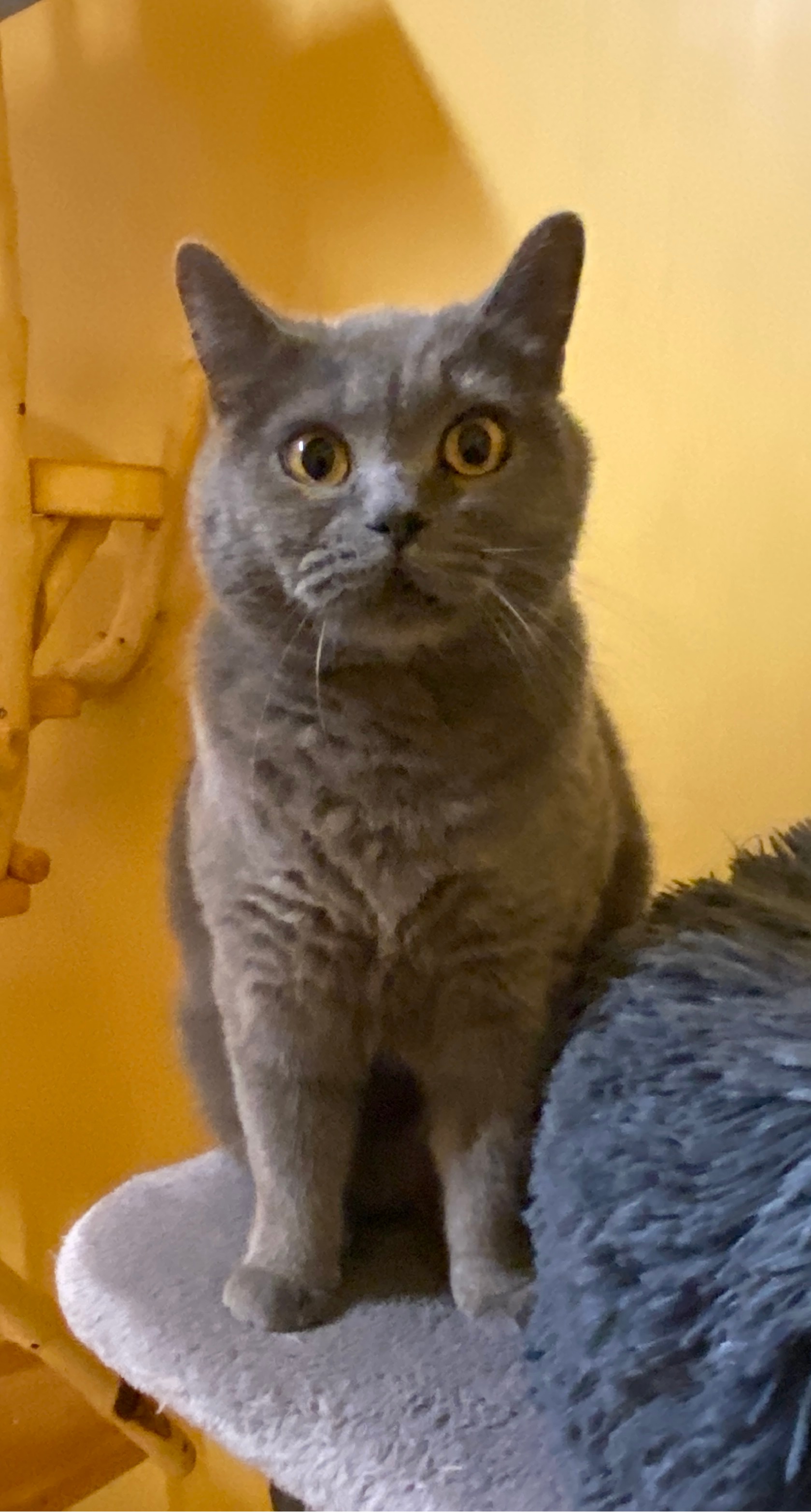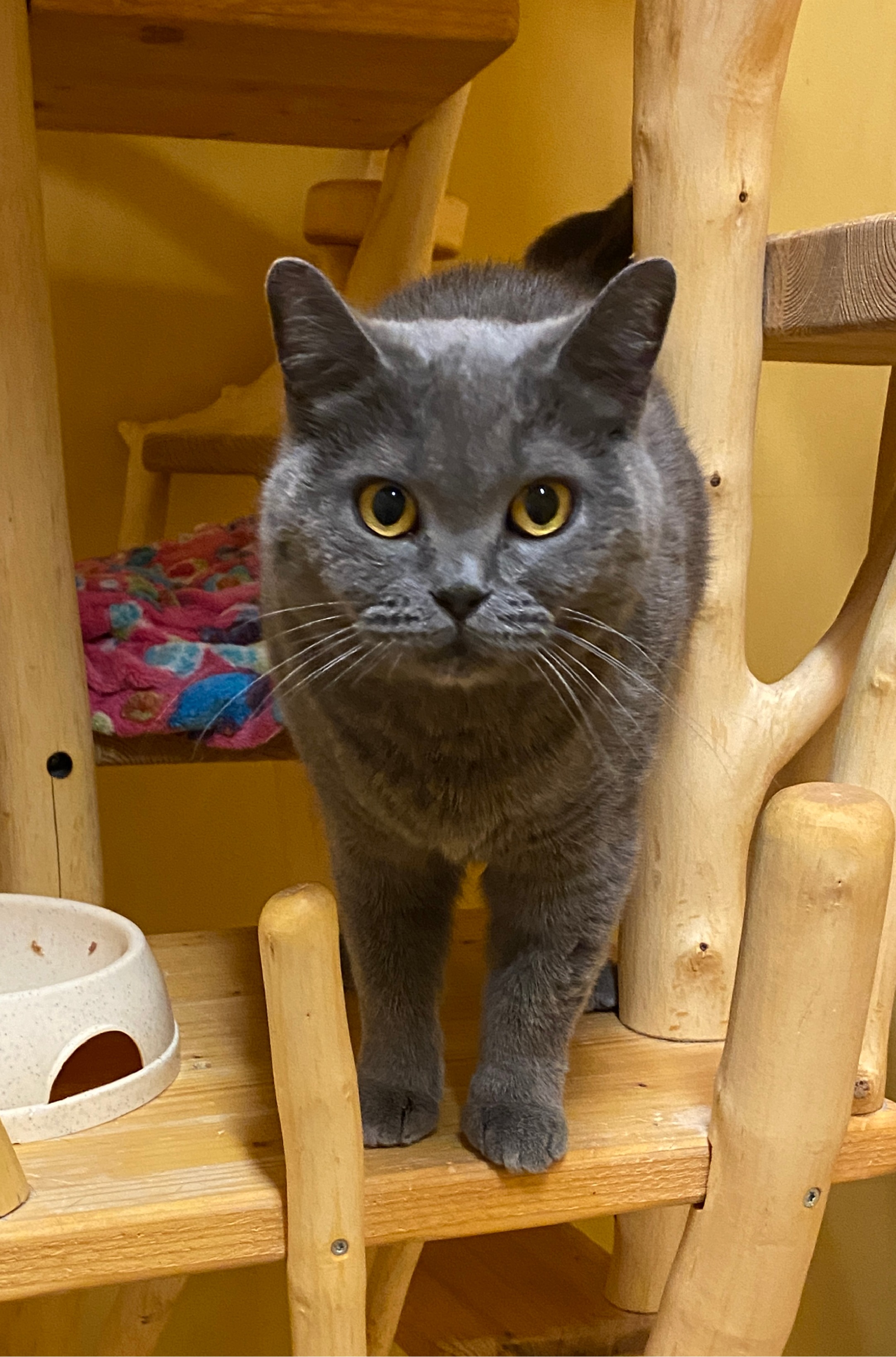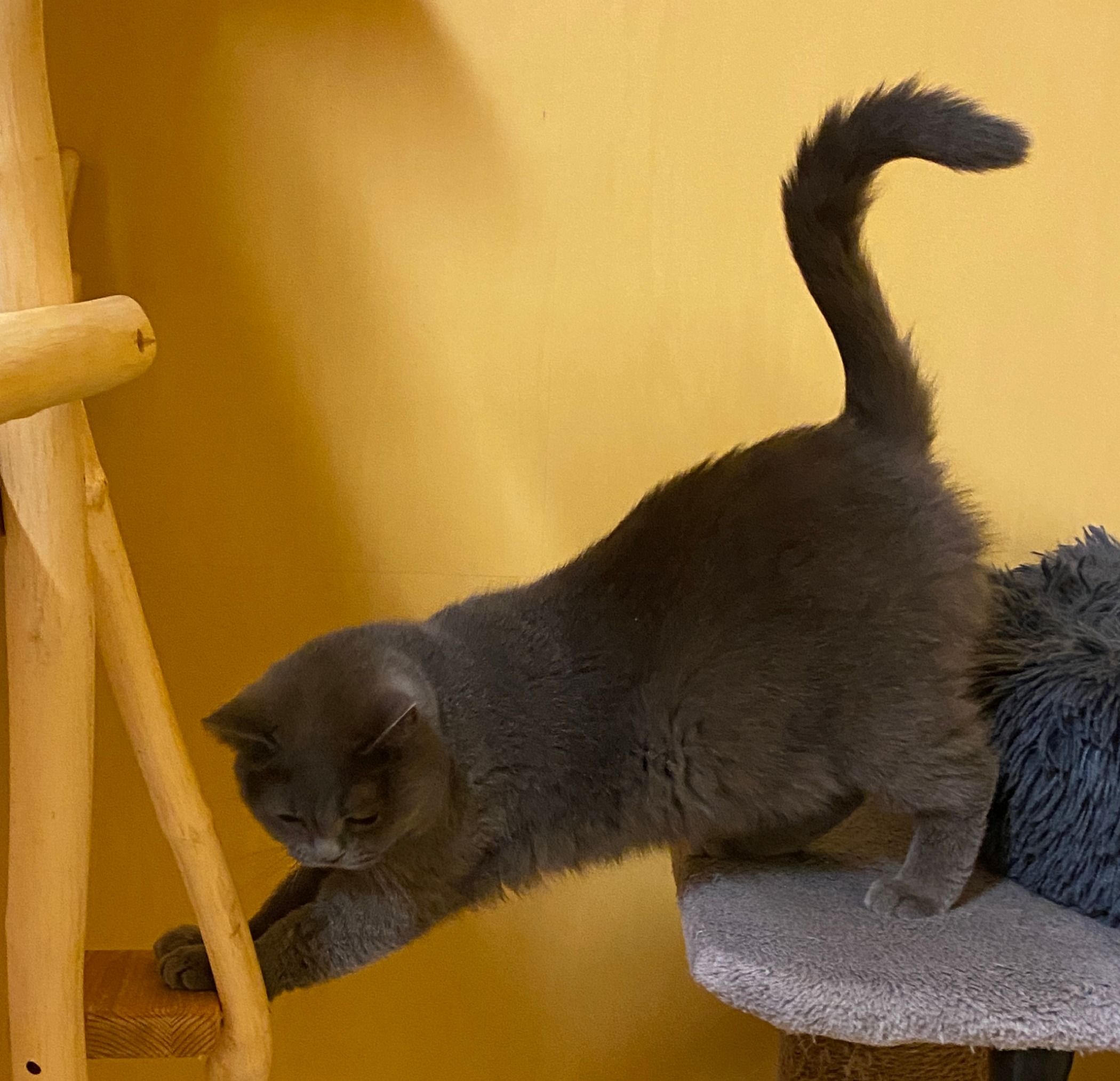 "Ich bin eine Katze mit russisch-blauem Einschlag, mit weichem grauem Fell und neugierigen Augen. Drinnen fühle ich mich am wohlsten, aber sobald eine Tür offen steht, nutze ich die Gelegenheit und schaue gern kurz nach draußen. Dort halte ich mich jedoch nie lange auf – ein paar Schritte, ein wenig frische Luft, dann möchte ich wieder zurück in die Sicherheit des Hauses."