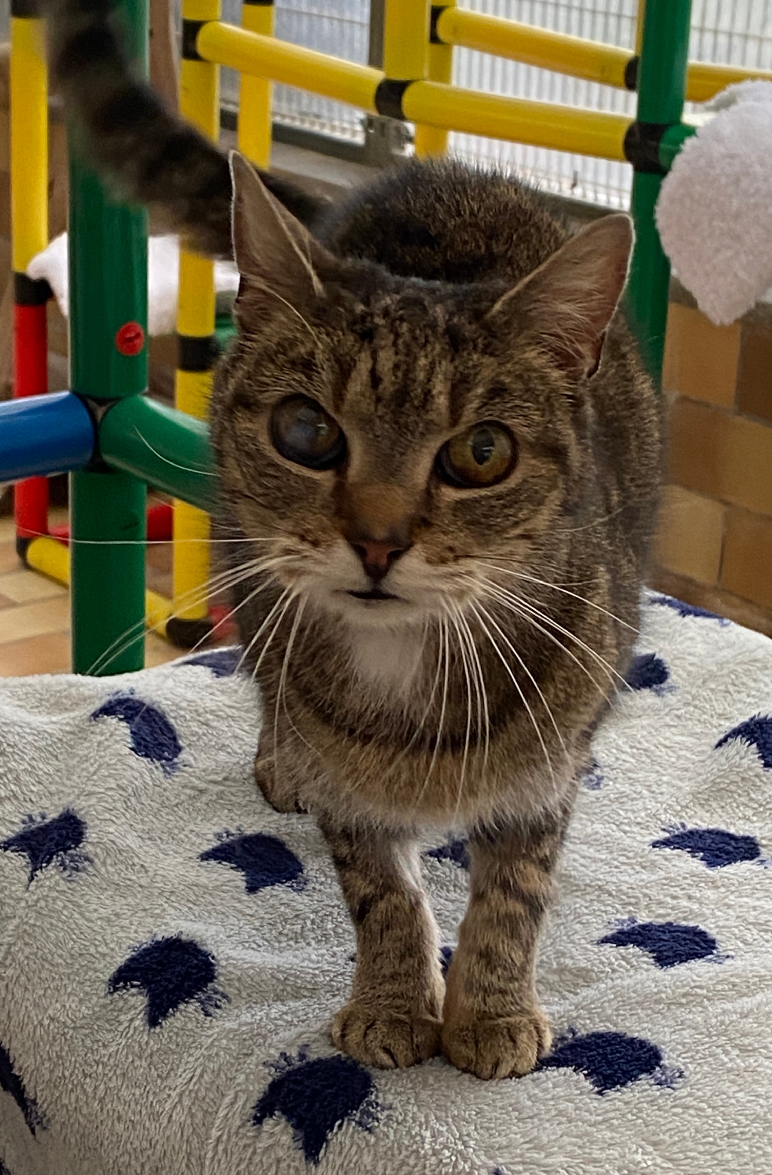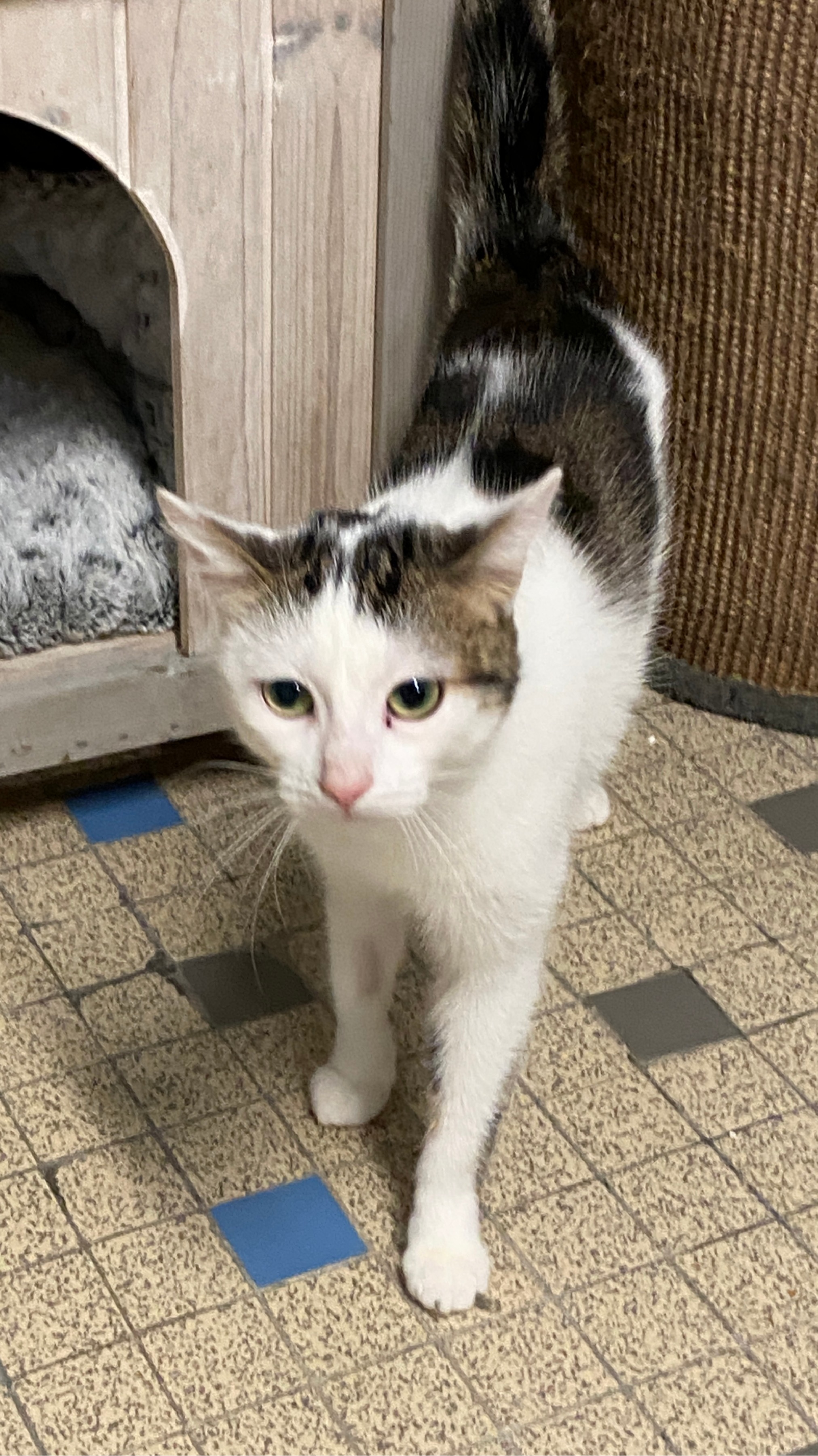 "Ich bin eine 10-jährige Katzendame, die sich ein gemütliches, liebevolles Zuhause wünscht. Lange Zeit habe ich auf der Straße gelebt. Eine nette Frau hat mich dort immer gefüttert – bis sie ins Altersheim ziehen musste. So kam ich ins Tierheim. Anfangs war alles für mich sehr ungewohnt, und ich brachte ein paar Baustellen mit : meine Zähne mussten gemacht werden (alles erledigt !), ich hatte Schnupfen und war so gestresst, dass ich fast nichts essen mochte, es gab Herzgeräusche, die sich zum Glück als unbedenklich herausgestellt haben, und ich habe eine alte Hornhautnarbe am Auge – die ist kosmetisch, bereitet mir aber keinerlei Probleme. Heute geht es mir wieder richtig gut. Ich fresse ordentlich, schnurre gern und genieße gemütliche Plätze (gerne in der Nähe von Aline). Jetzt bin ich bereit für mein eigenes Für-immer-Zuhause."