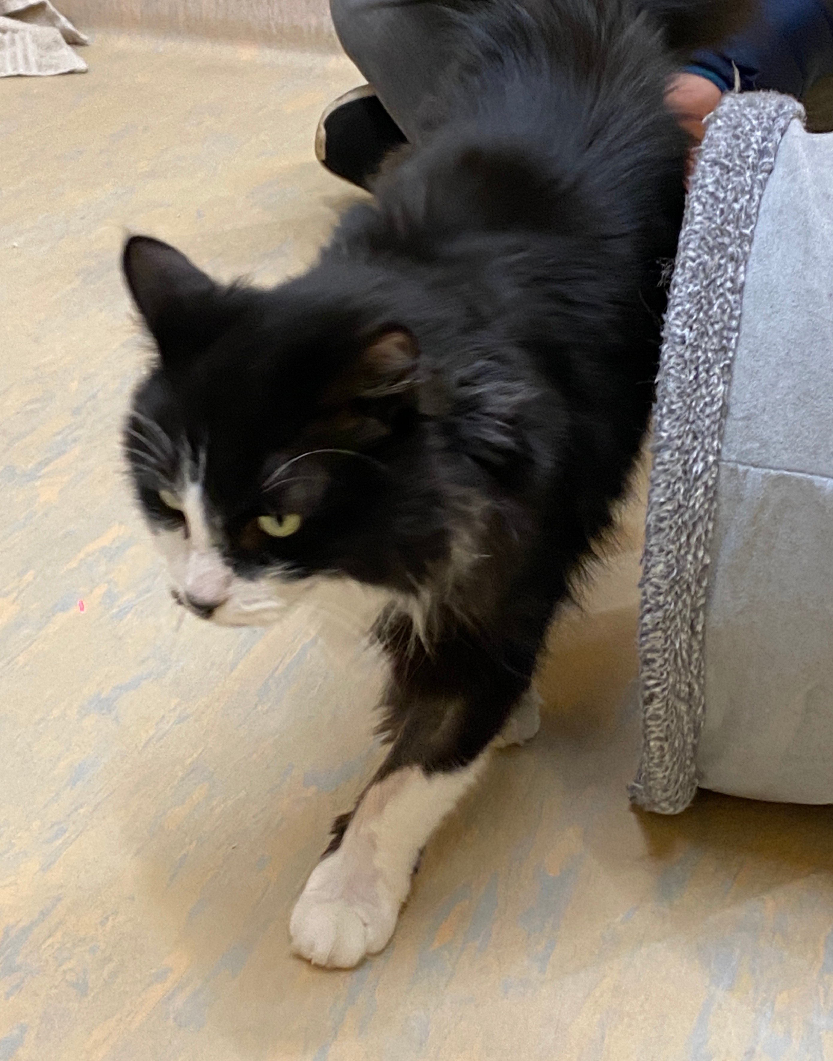 "Man könnte mich glatt mit Wuschel verwechseln : schwarz-weißes, langes Fell, ein charmantes Wesen und sehr lieb sowie verschmust. Leider habe ich – genau wie Wuschel – eine Neigung zur Bildung von Blasensteinen. Diese wurden mir vor Kurzem operativ entfernt, und die Nachwirkungen des Eingriffs sind noch spürbar. Es braucht einfach noch etwas Zeit, bis alles vollständig verheilt ist. Zur Unterstützung der Heilung bekomme ich aktuell noch ein flüssiges Medikament, das ich brav und ganz ohne Mätzchen einnehme. Wuschel hat relativ schnell ein neues Zuhause gefunden – darauf hoffe ich nun ebenfalls sehr."