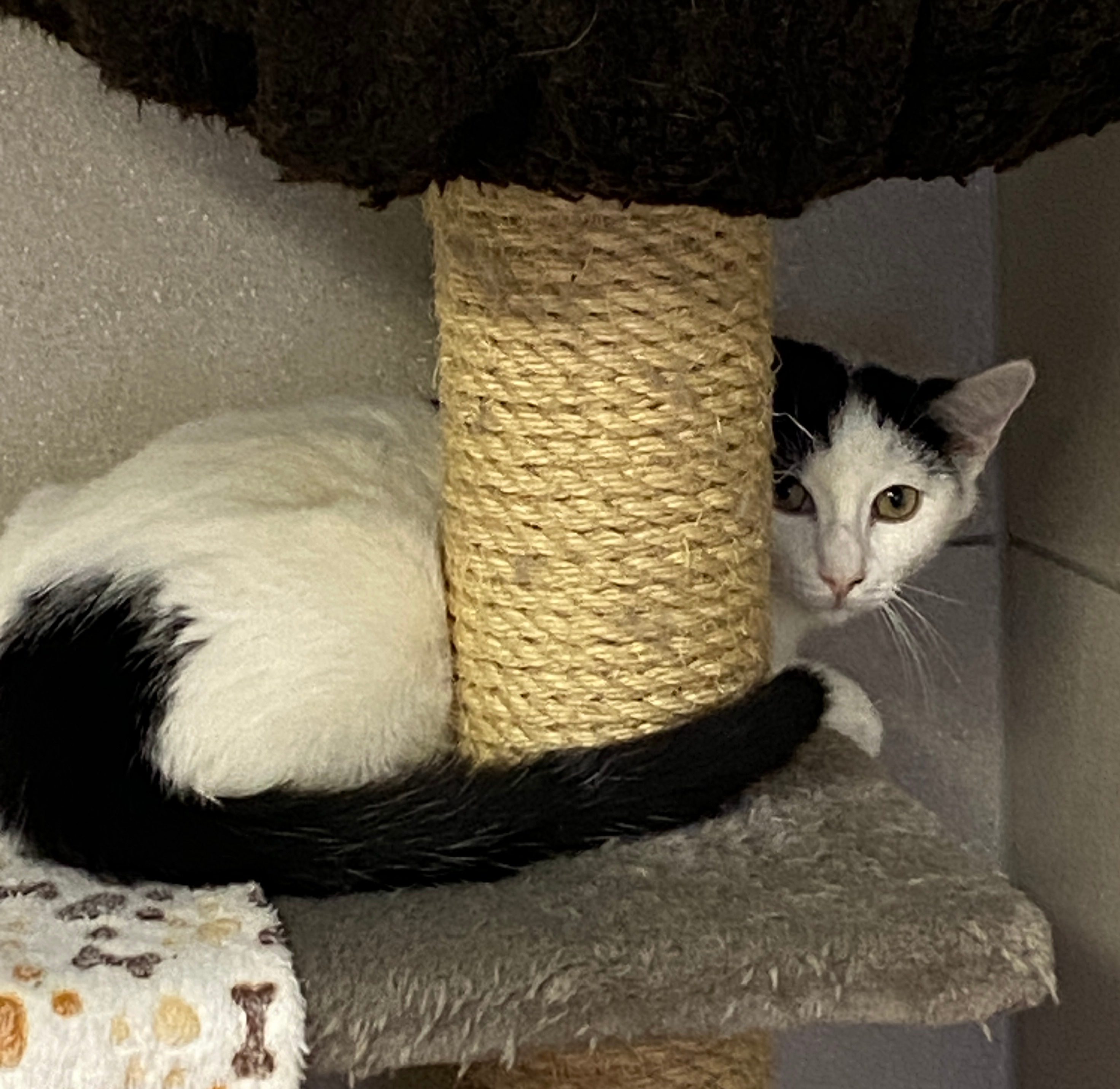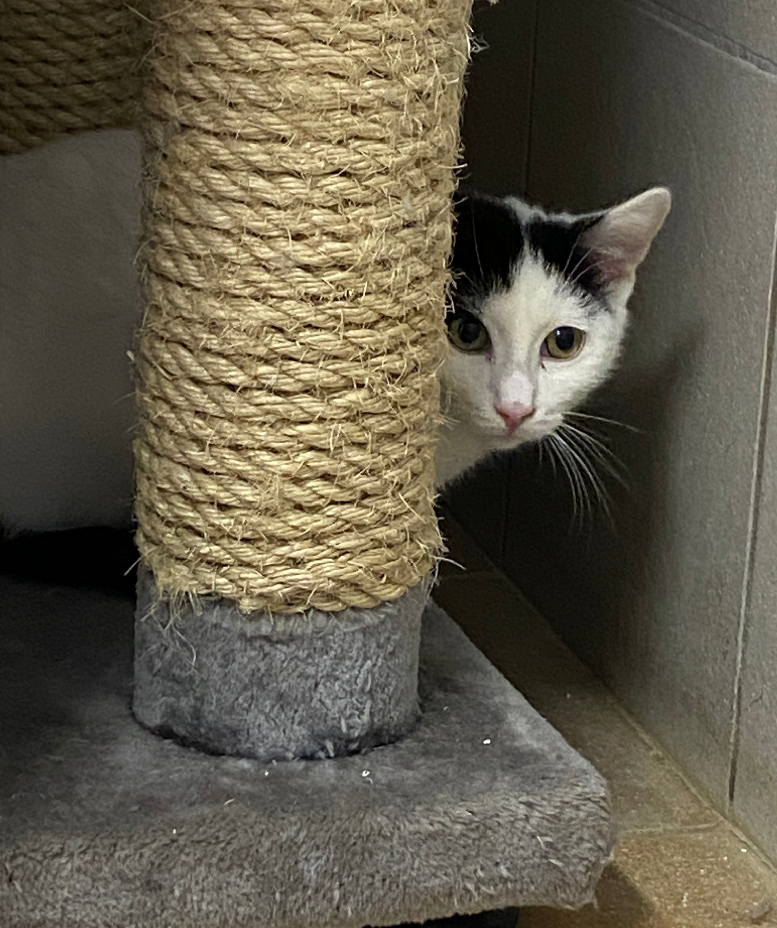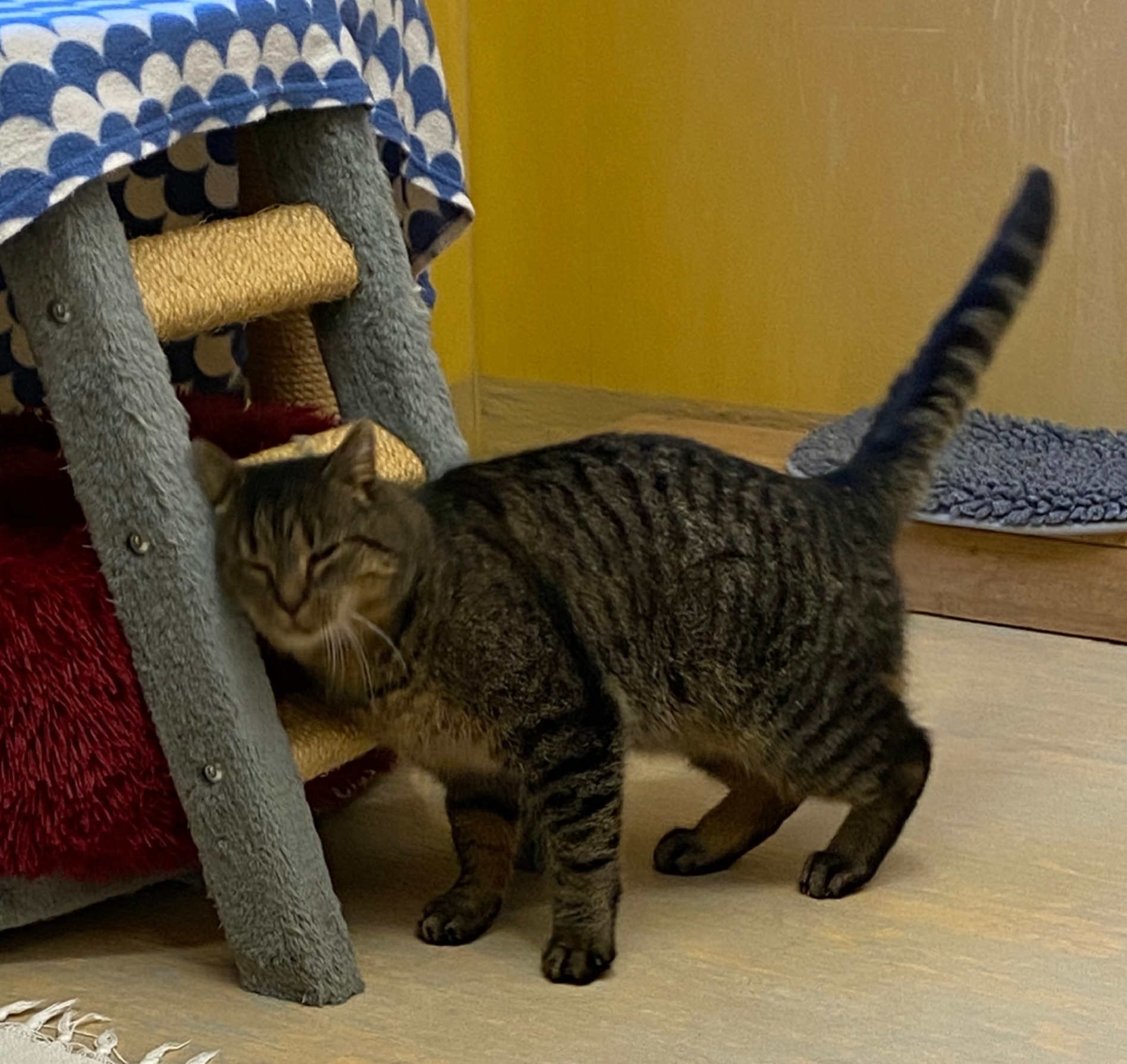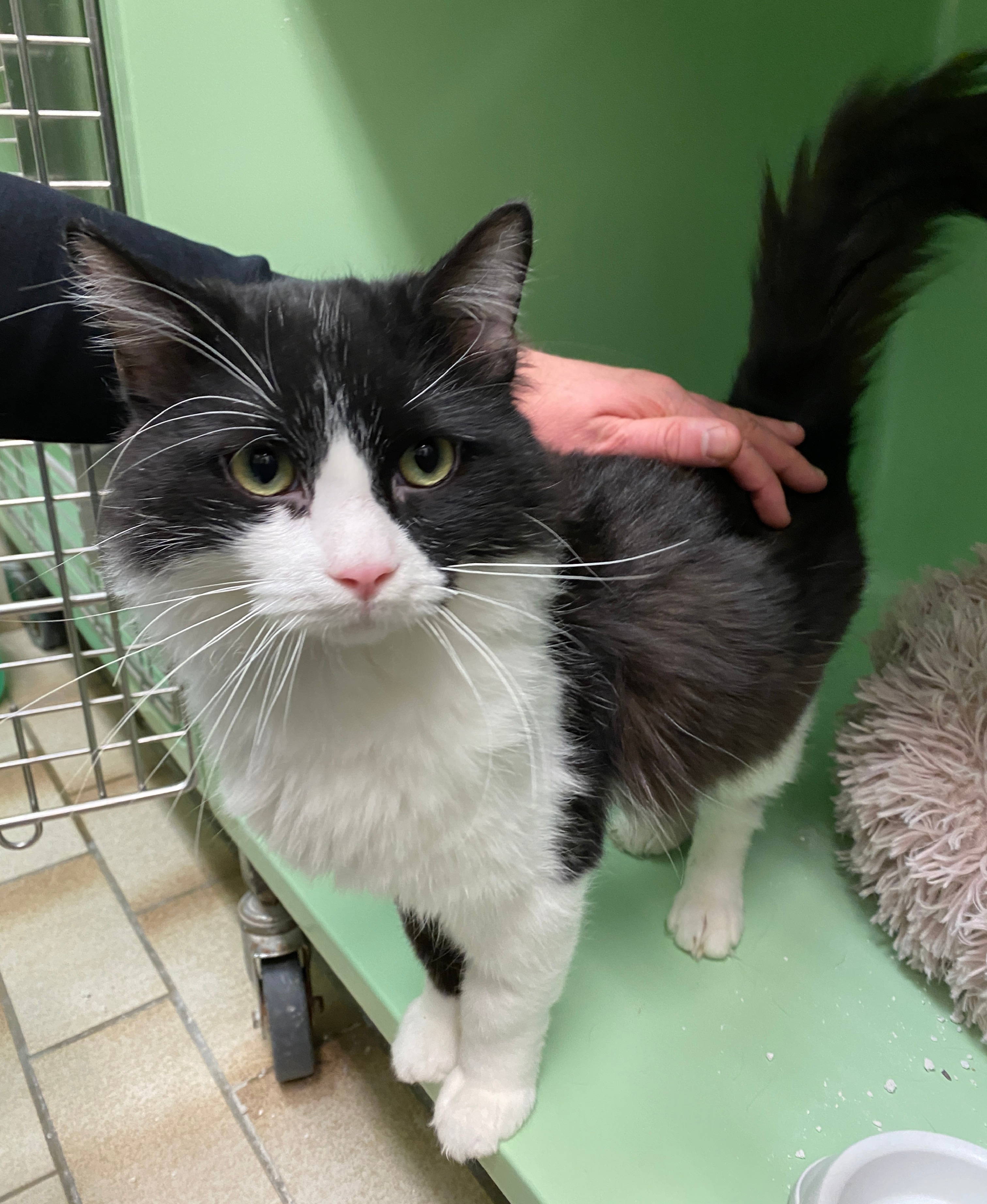 "Wir waren mehrere, die sich zum täglichen Mittagessen - ohne Verpflichtungen - bei einer älteren Dame einfanden. Allerlei Leckeres wurde dort aufgetischt, daher standen wir immer pünktlich auf der Matte. Zu unserem grössten Bedauern zog die nette Lady ins Altersheim, sodass unsere Futterquelle von jetzt auf gleich versiegt war. Deswegen war es nicht schwer, uns alle einzusammeln und ins Asile zu bringen. Mittlerweile lebe ich schon einige Monate hier im Tierheim. Noch immer bin ich sehr vorsichtig und habe bisher leider nicht gelernt, Menschen ganz zu vertrauen. Anfassen lasse ich mich daher noch nicht – dafür brauche ich einfach mehr Zeit. Es gibt aber auch gute Nachrichten : Für leckere Snacks bin ich immer zu haben, und dabei traue ich mich sogar schon ein kleines Stück näher heran. Manchmal spiele ich sogar vorsichtig mit einer Schnur – ein kleiner Moment, in dem meine Neugier gewinnt. Jetzt, wo es draußen kälter wird, suche ich außerdem häufiger den warmen Innenbereich des Tierheims auf – ein kleines Zeichen dafür, dass ich mich langsam etwas wohler fühle."