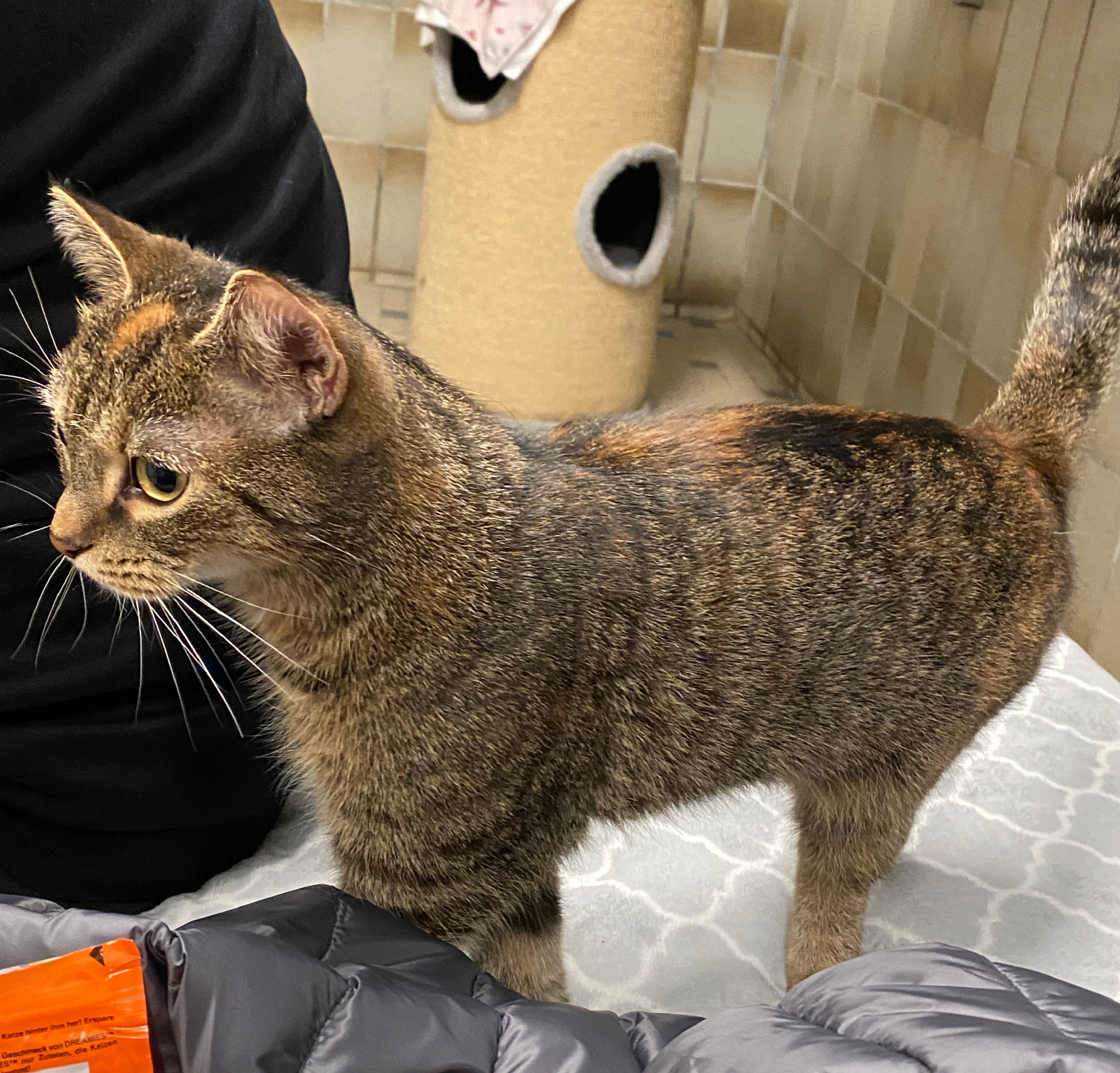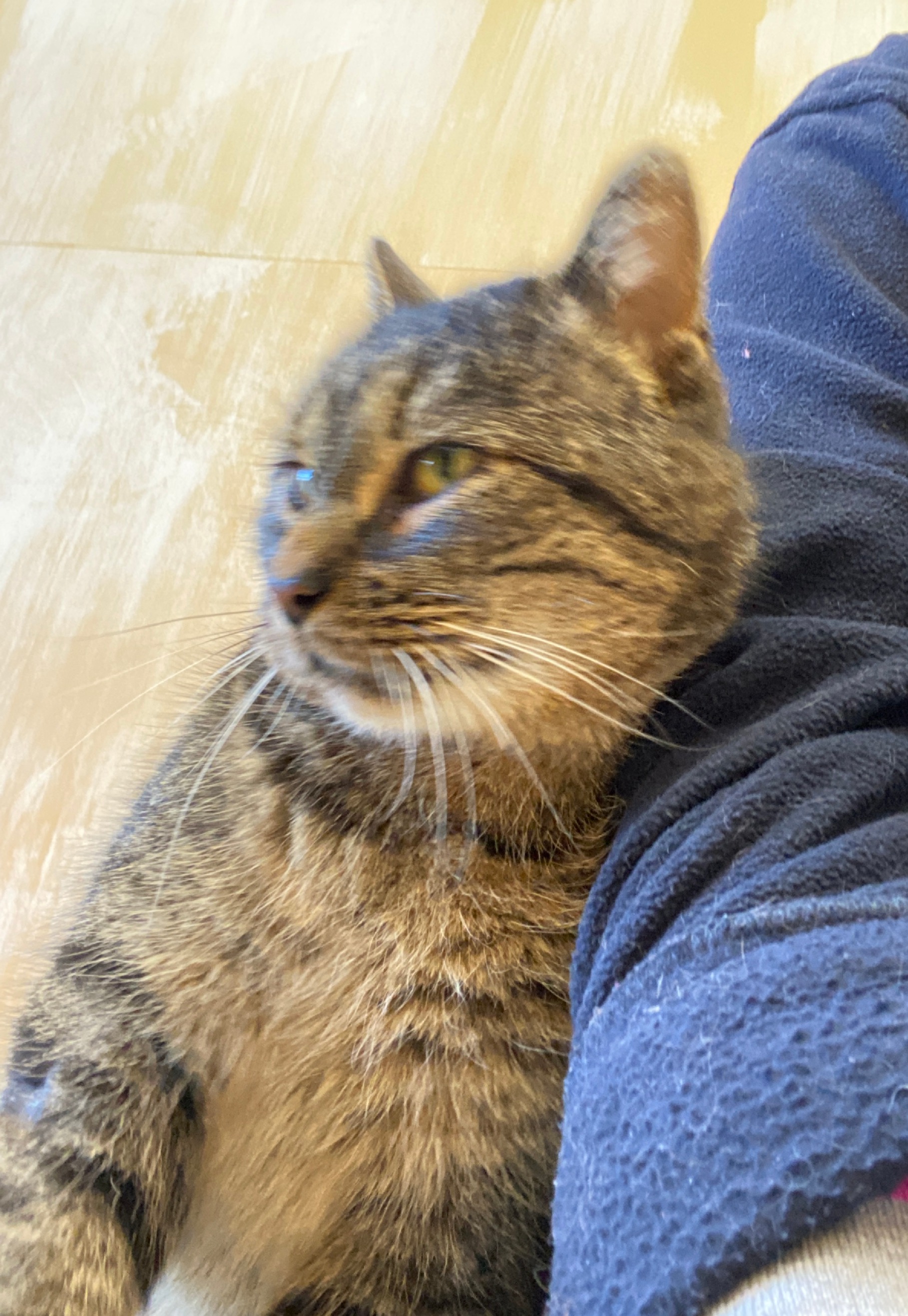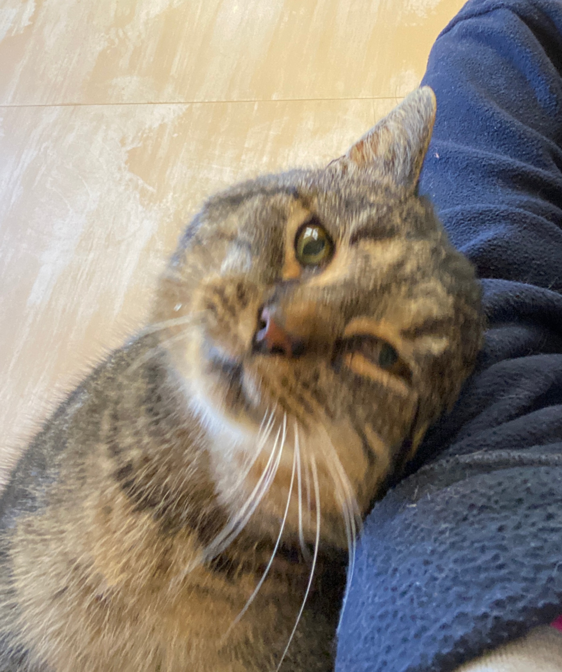 "Ich bin eine 10-jährige Katzendame, die sich ein gemütliches, liebevolles Zuhause wünscht. Lange Zeit habe ich auf der Straße gelebt. Eine nette Frau hat mich dort immer gefüttert – bis sie ins Altersheim ziehen musste. So kam ich ins Tierheim. Anfangs war alles für mich sehr ungewohnt, und ich brachte ein paar Baustellen mit : meine Zähne mussten gemacht werden (alles erledigt !), ich hatte Schnupfen und war so gestresst, dass ich fast nichts essen mochte, es gab Herzgeräusche, die sich zum Glück als unbedenklich herausgestellt haben, und ich habe eine alte Hornhautnarbe am Auge – die ist kosmetisch, bereitet mir aber keinerlei Probleme. Heute geht es mir wieder richtig gut. Ich fresse ordentlich, schnurre gern und genieße gemütliche Plätze (gerne in der Nähe von Aline). Jetzt bin ich bereit für mein eigenes Für-immer-Zuhause."