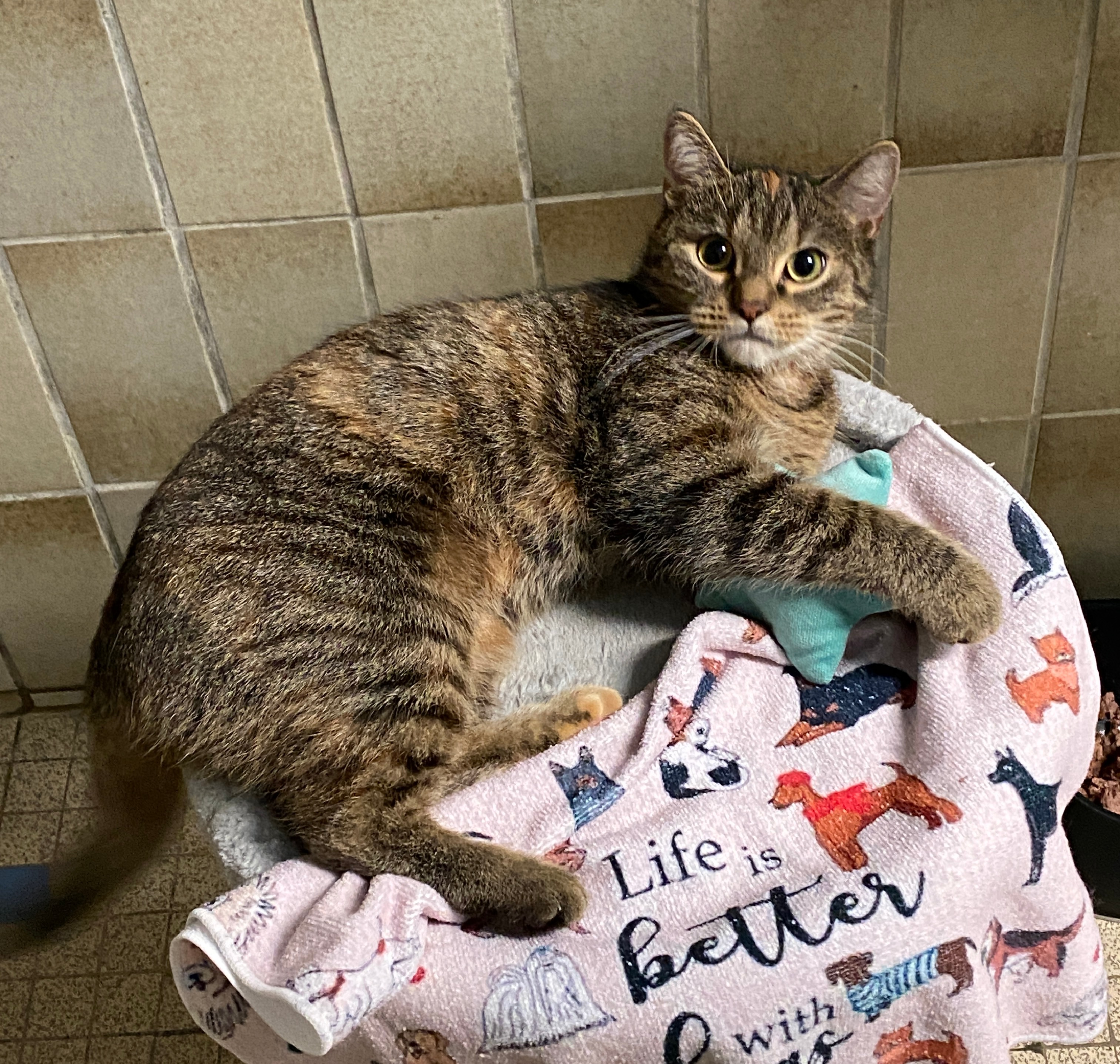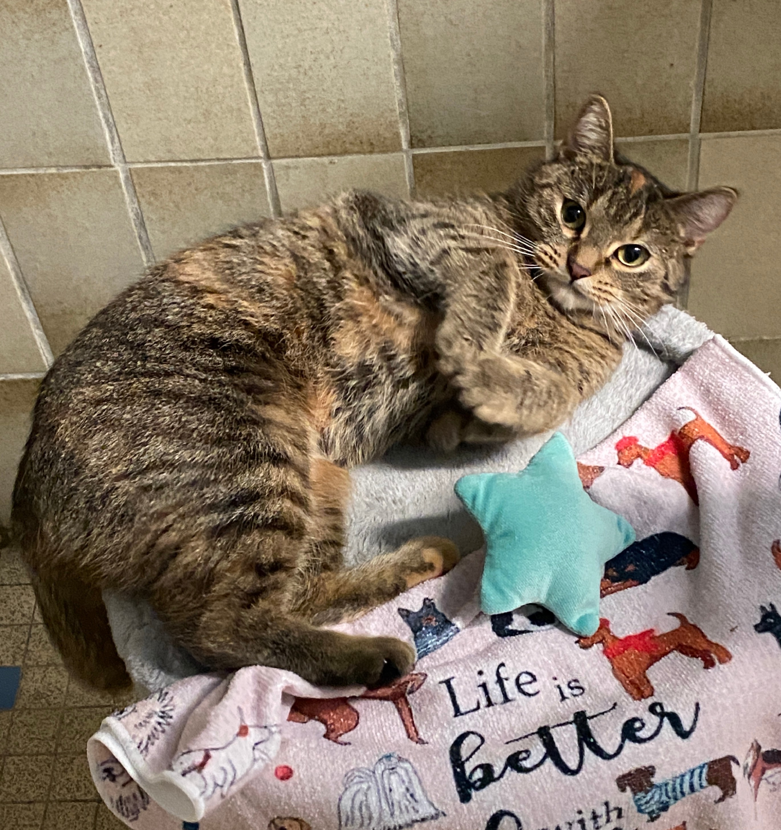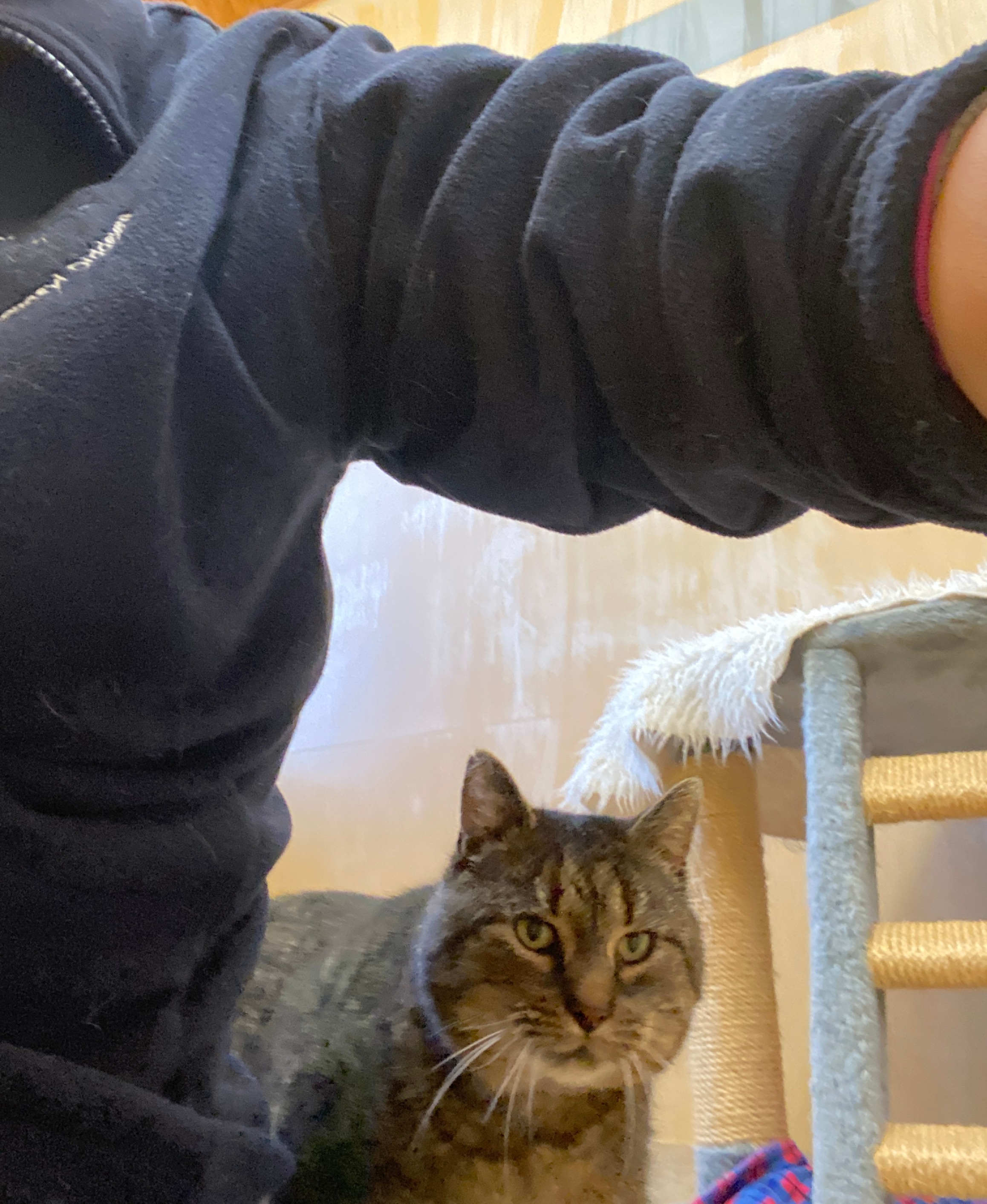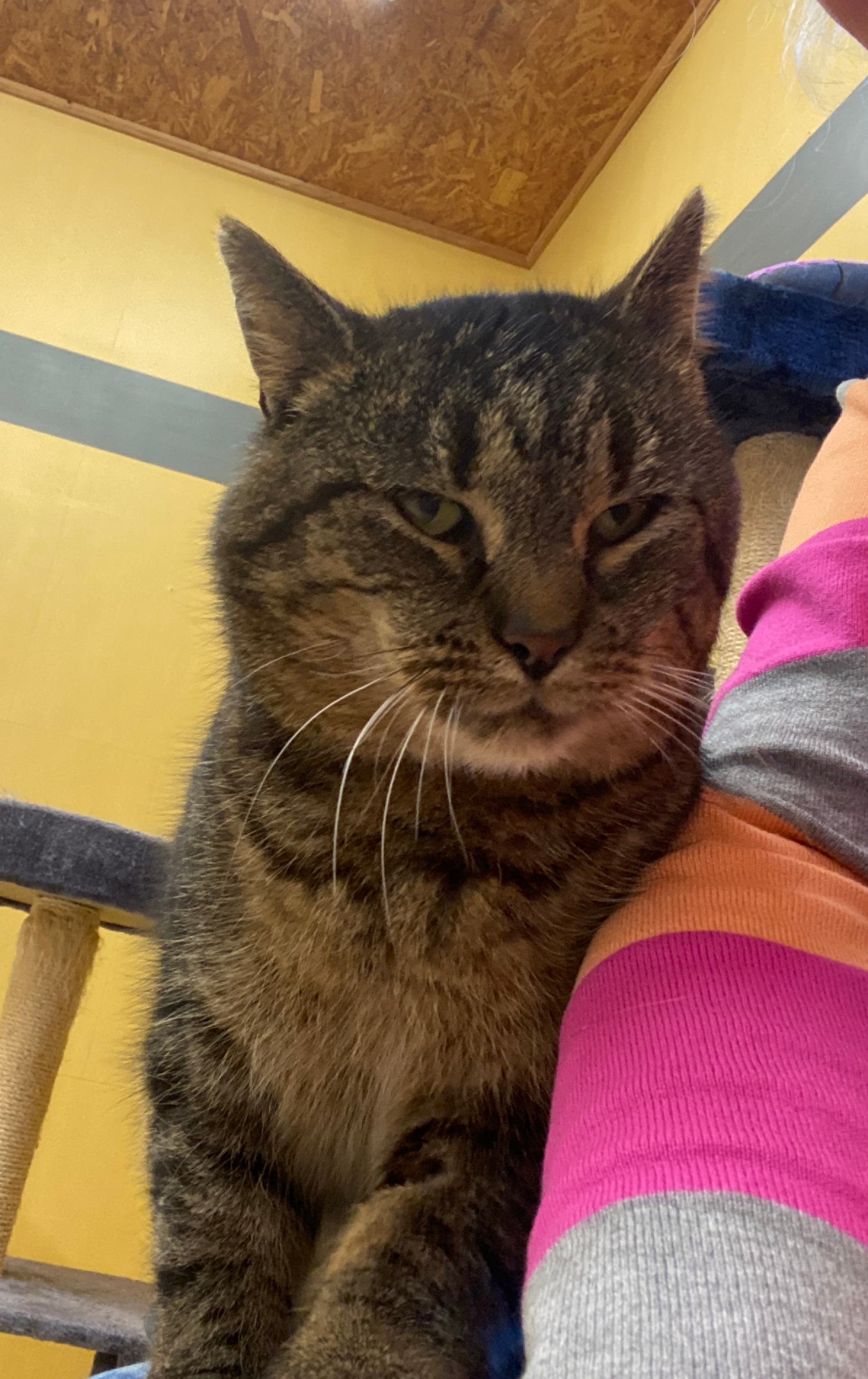 "Ich bin eine 10-jährige Katzendame, die sich ein gemütliches, liebevolles Zuhause wünscht. Lange Zeit habe ich auf der Straße gelebt. Eine nette Frau hat mich dort immer gefüttert – bis sie ins Altersheim ziehen musste. So kam ich ins Tierheim. Anfangs war alles für mich sehr ungewohnt, und ich brachte ein paar Baustellen mit : meine Zähne mussten gemacht werden (alles erledigt !), ich hatte Schnupfen und war so gestresst, dass ich fast nichts essen mochte, es gab Herzgeräusche, die sich zum Glück als unbedenklich herausgestellt haben, und ich habe eine alte Hornhautnarbe am Auge – die ist kosmetisch, bereitet mir aber keinerlei Probleme. Heute geht es mir wieder richtig gut. Ich fresse ordentlich, schnurre gern und genieße gemütliche Plätze (gerne in der Nähe von Aline). Jetzt bin ich bereit für mein eigenes Für-immer-Zuhause."