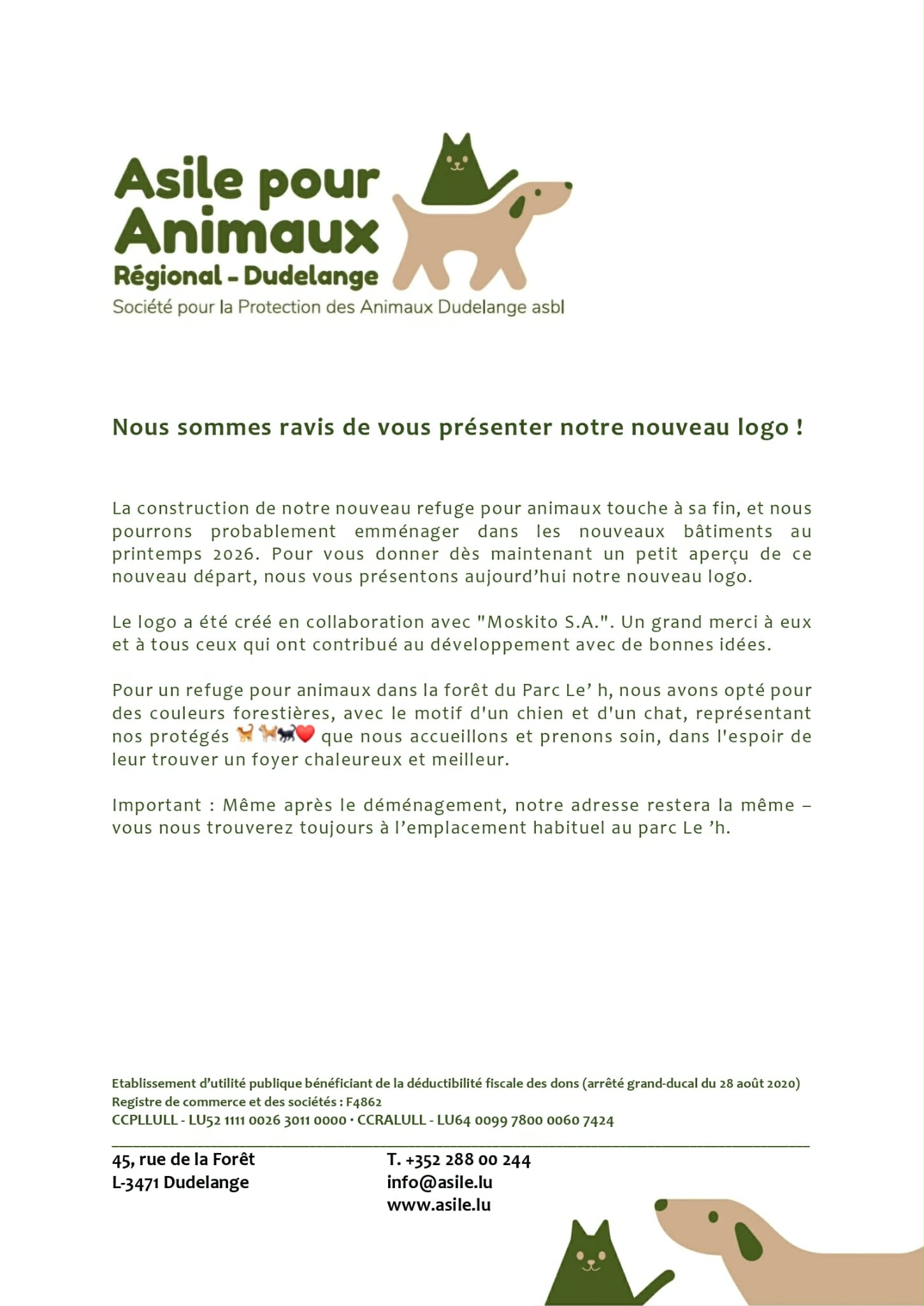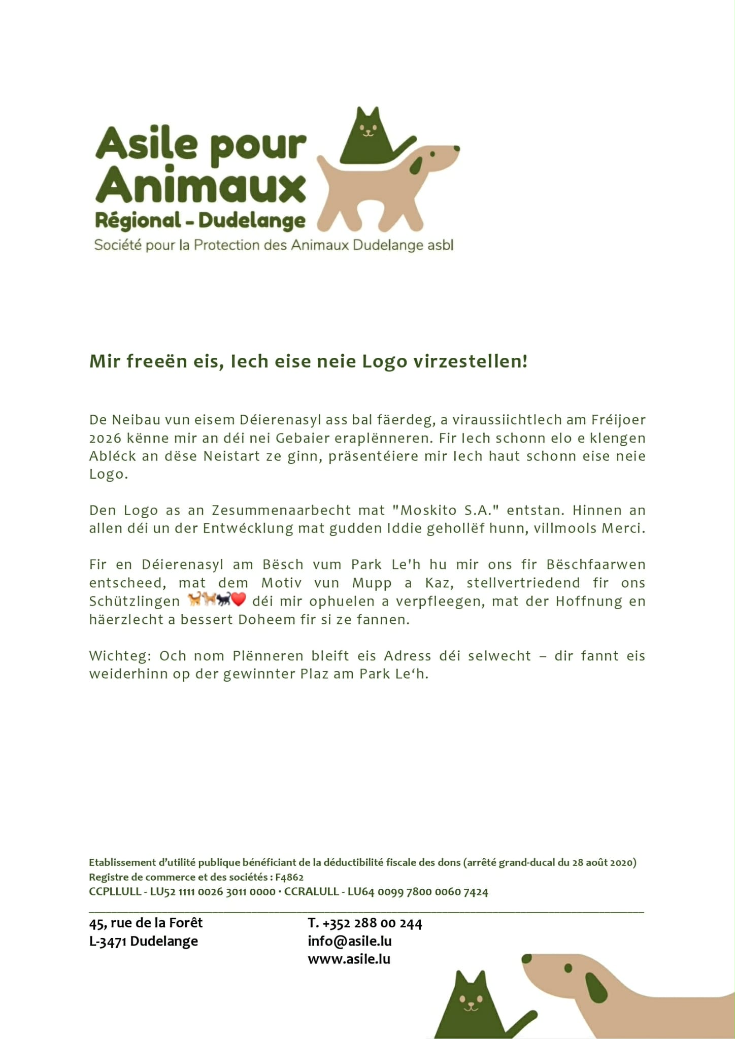De Neibau vun eisem Déierenasyl ass bal fäerdeg, a viraussiichtlech am Fréijoer 2026 kënne mir an déi nei Gebaier eraplënneren. Fir Iech schonn elo e klengen Abléck an dëse Neistart ze ginn, präsentéiere mir Iech haut schonn eise neie Logo.